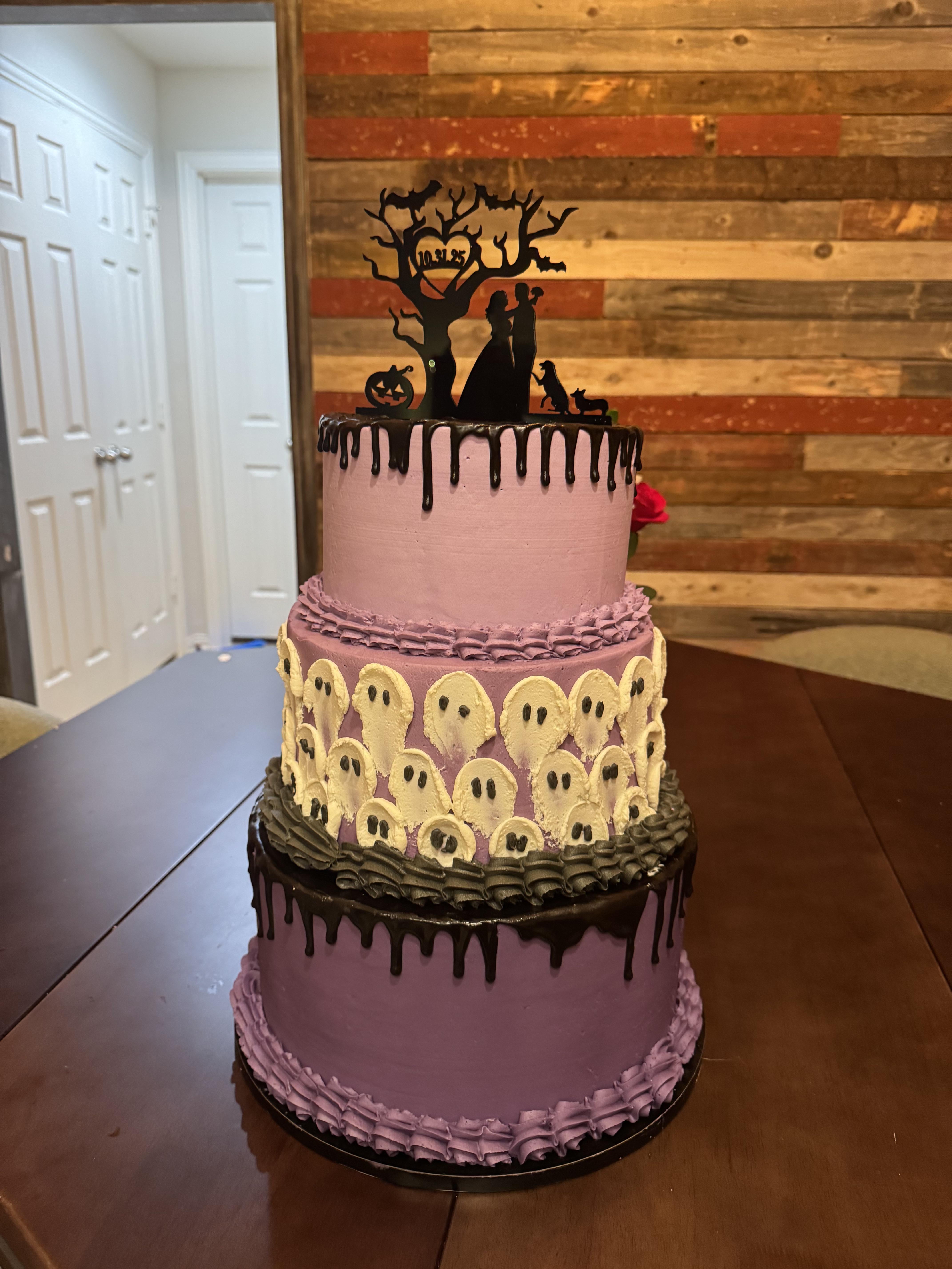 The piping on the borders is so clean! And the ghosts on the middle tier are adorable lol