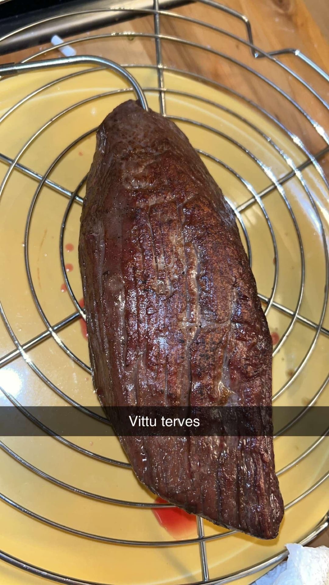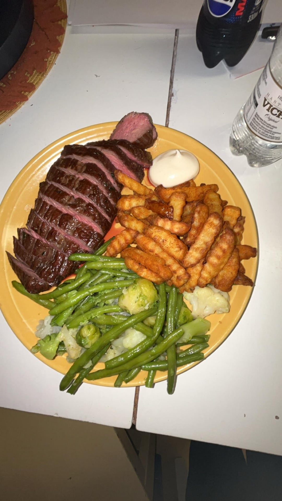 Reverse seared in 120’c till 52’c internal, seared in a hot cast iron in avocado oil and basted with butter with garlic and thyme. Fries, green beans, broccoli,cauliflower and brussel sprouts on the side.