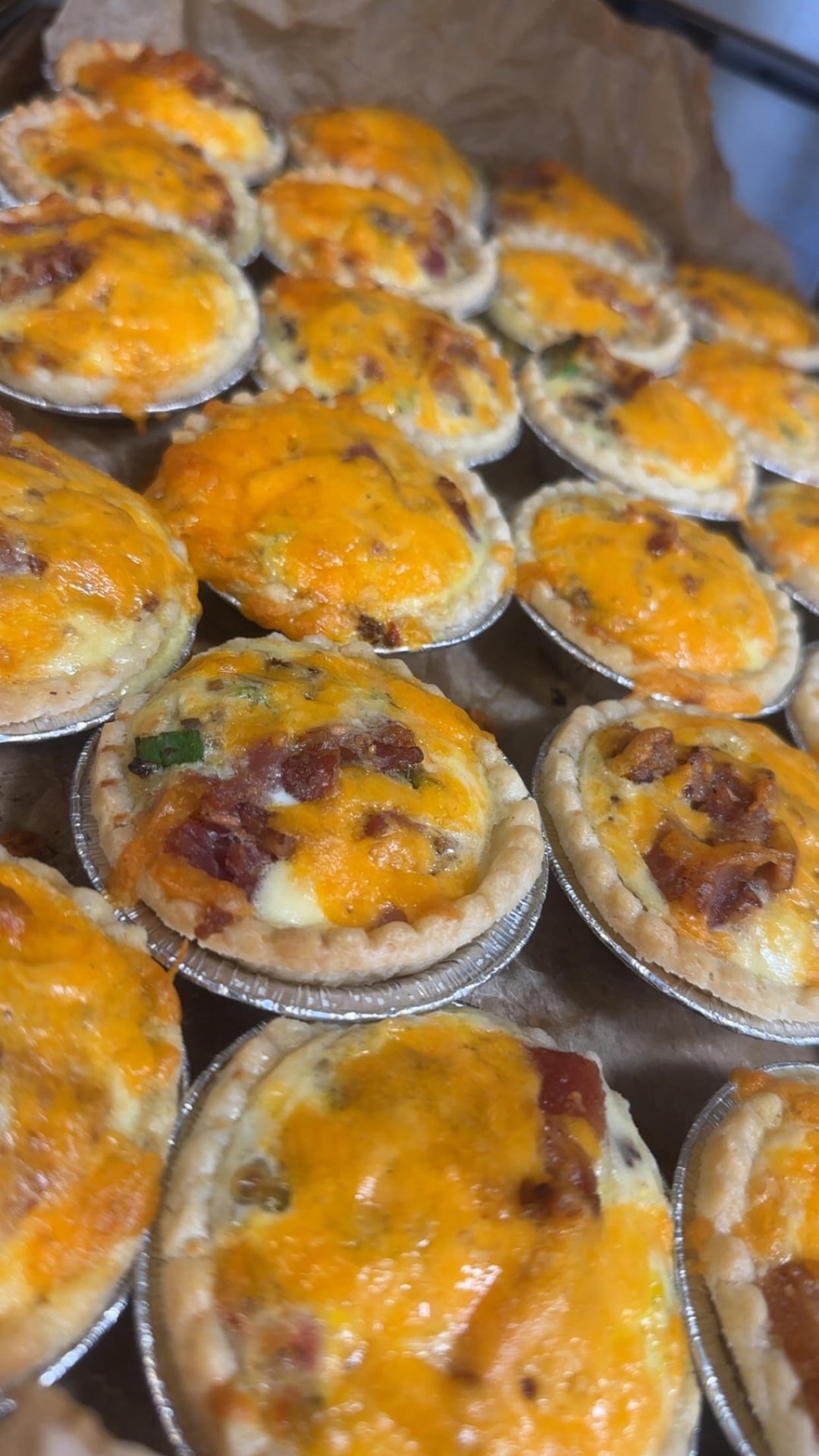 Quiches: I put some, diced bacon, diced mushrooms, peppers and chopped green onion, plus shredded cheese in tart shells, then used a small condiment bottle to fill them with eggs. (eggs were whisked until mixed with a couple tbsp of milk per 8 eggs, and some salt and pepper) Baked on a tray at 350 until the egg is cooked through.