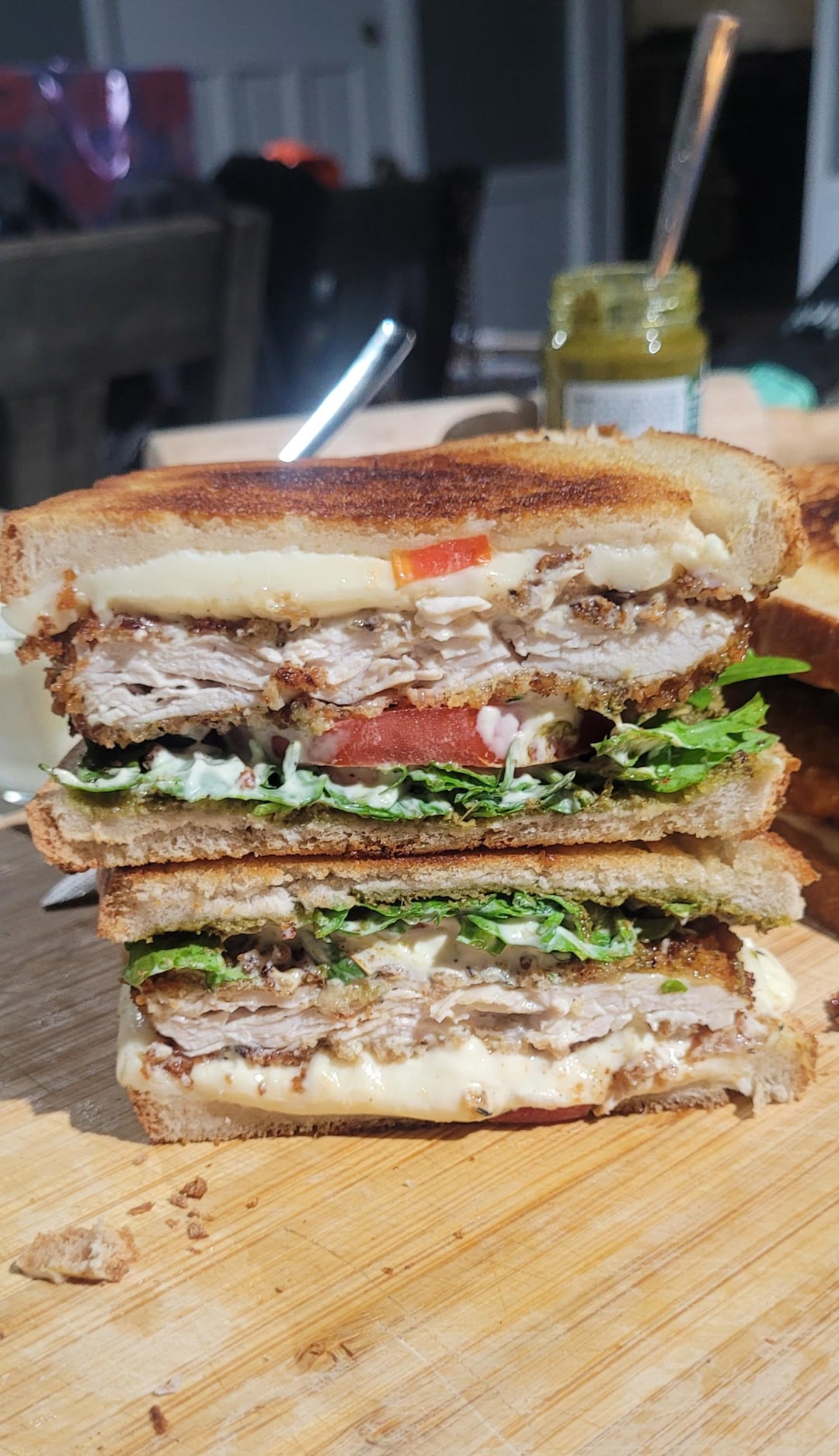 Grilled sourdough, homemade chicken cutlet, mozzarella, dijon mayo, marinated tomatoes, pesto and arugula! It was so good!by ServiceFinal952 10 Comments gingerbeard1321 4 months ago wee obla! 🤤 Rough-Echo-5193 4 months ago Non-butterflied breast cutlet? Hellllllll yeah.E: And the tomatoes are marinated? This is a sandwich, folks. Timmoncaster 4 months ago That look good gmanee 4 months ago If ever I’ve seen a sandwich that made me want to cry. It’s just so beautiful. Impressive-Sun3742 4 months ago That looks mighty fine Sk8rboyyyy 4 months ago That is proper bigprick99 4 months ago Perfect job on that chicken my guy. 10/10 would devour. AdventurousRub5139 4 months ago Making me hungry… I want one. MagazineDelicious151 4 months ago Looks like a solid sandwich. xXxxGunxXx 4 months ago This is some quality work!