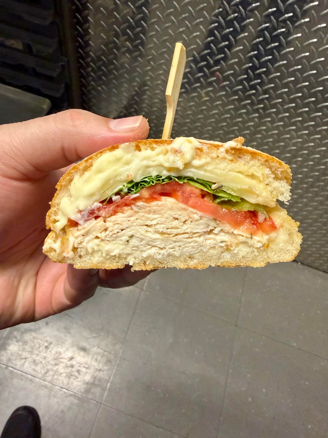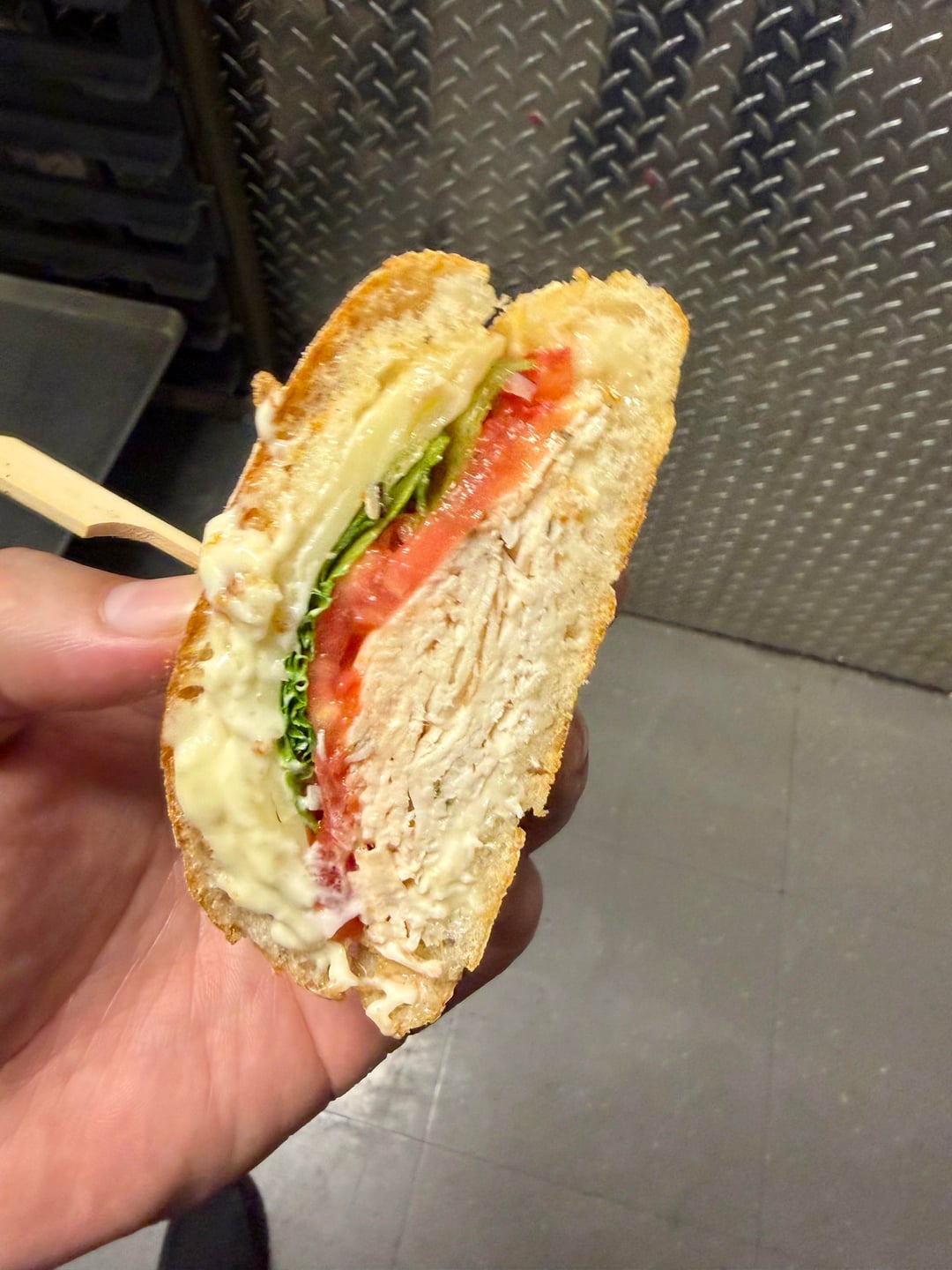 Turkey and Swiss with lettuce, tomatoes, salt, pepper, oil and vinegar at 4am.