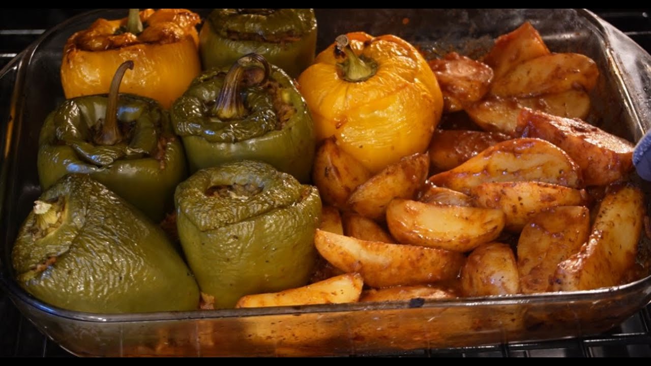 While the meat sauce is cooking, hallow out the peppers as shown in the video and save the tops to cover while baking. Bake a 350 to 375℉ oven covered with parchment paper and aluminum foil for 35 minutes. Remove the cover and let bake an additional 35 to 40 minutes or until everything is tender. If you need to add extra water and tomato sauce while baking, you can do that. Depending on your oven, you may need to.