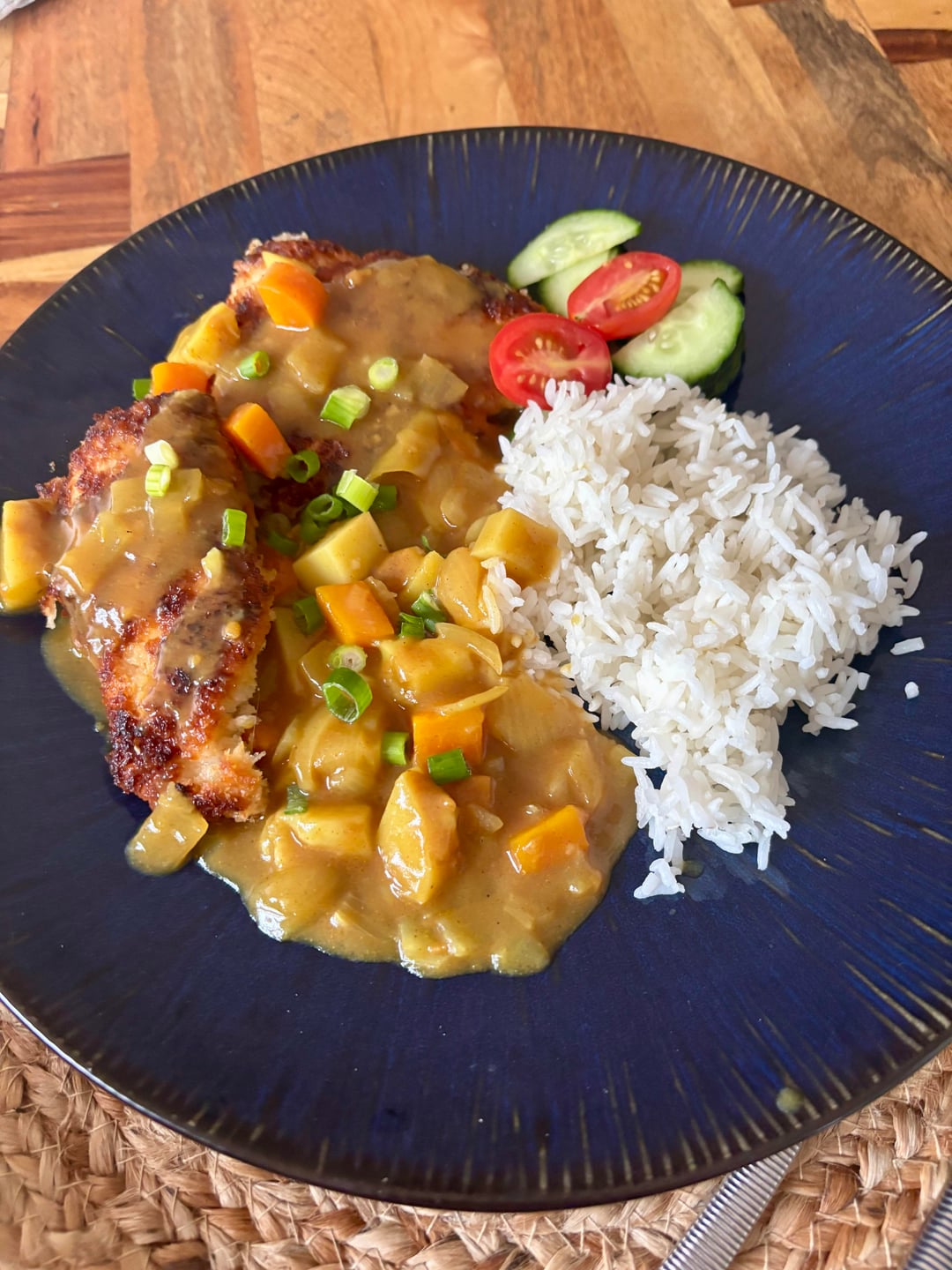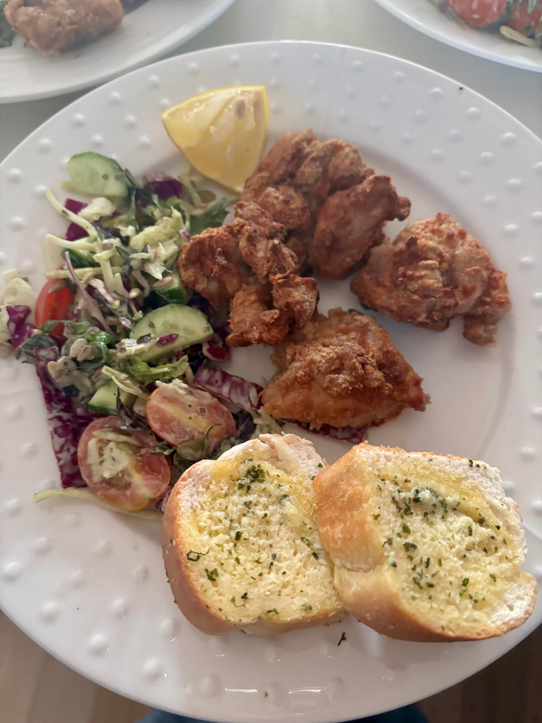 Chicken kaarage – air fried but the thighs were marinated first so they stayed juicy. With green goddess salad and garlic bread.