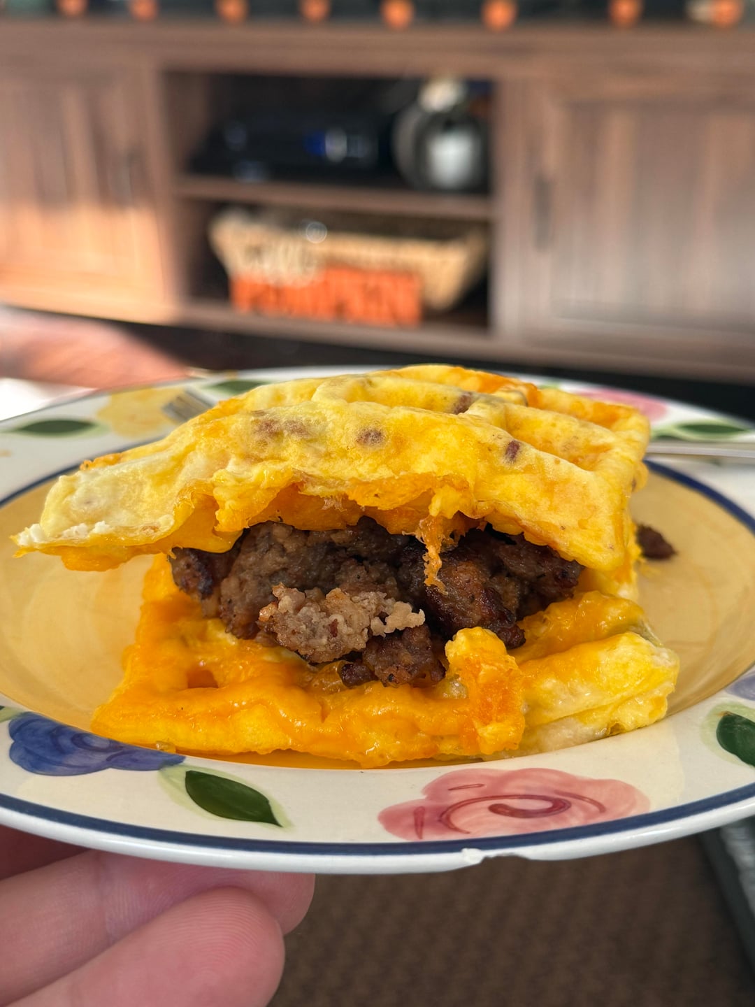 I put crumbled breakfast sausage in the middle of my egg waffles.