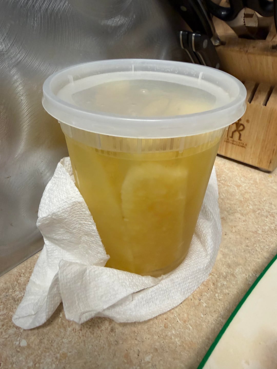 One container of pickled pineapple. Some of the pickle juice instead of salt.