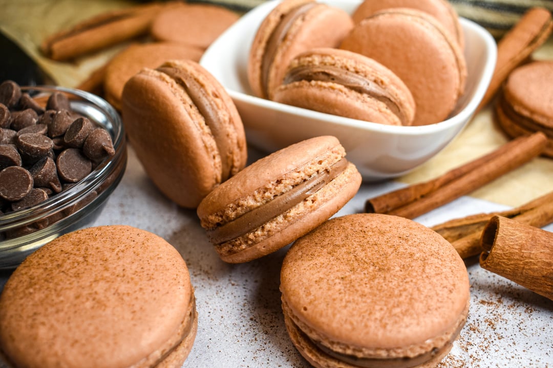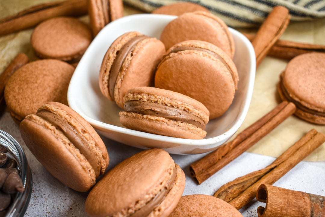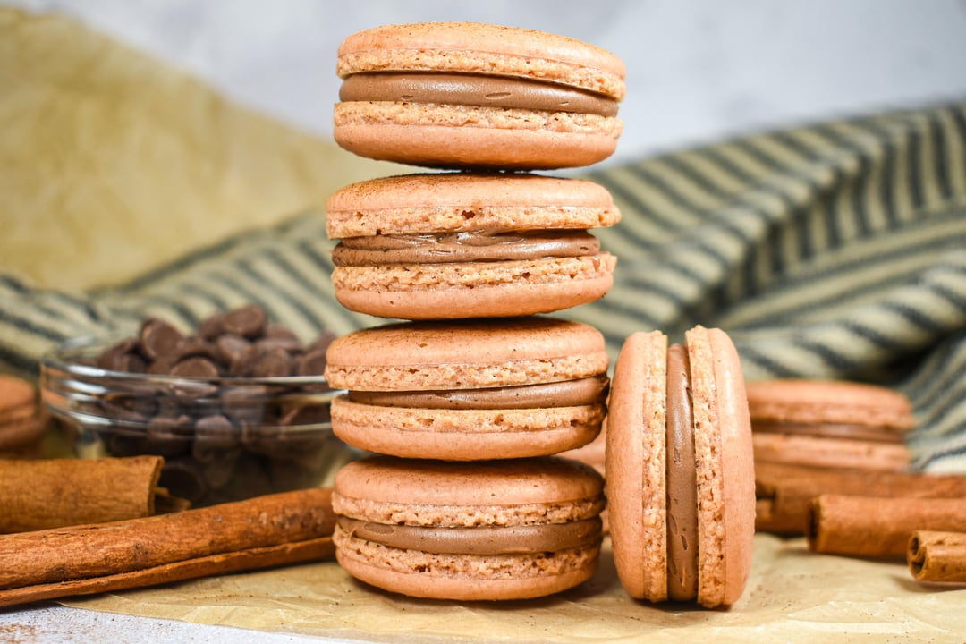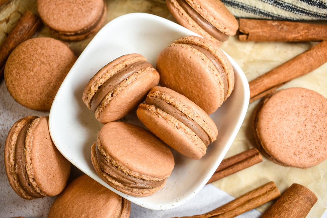 Autumn-inspired chai macarons featuring a creamy, chai-infused milk chocolate ganache sandwiched between a pair of classic French macaron shells, plus a dusting of cinnamon on top.