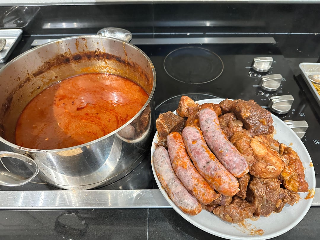 Beef chuck, pork rib, pork shoulder. Mild Italian sausage added in the last 30 minutes. Reduced in the oven. With Fall here, I’m looking for those comforting, hearty dishes. I’ve been making lots of beans and stews but it was time to go a bit bigger. While I love a bolognese-style ragù, this is a beautiful sauce that reminds me of the ragù my Italian father made when I was growing up.