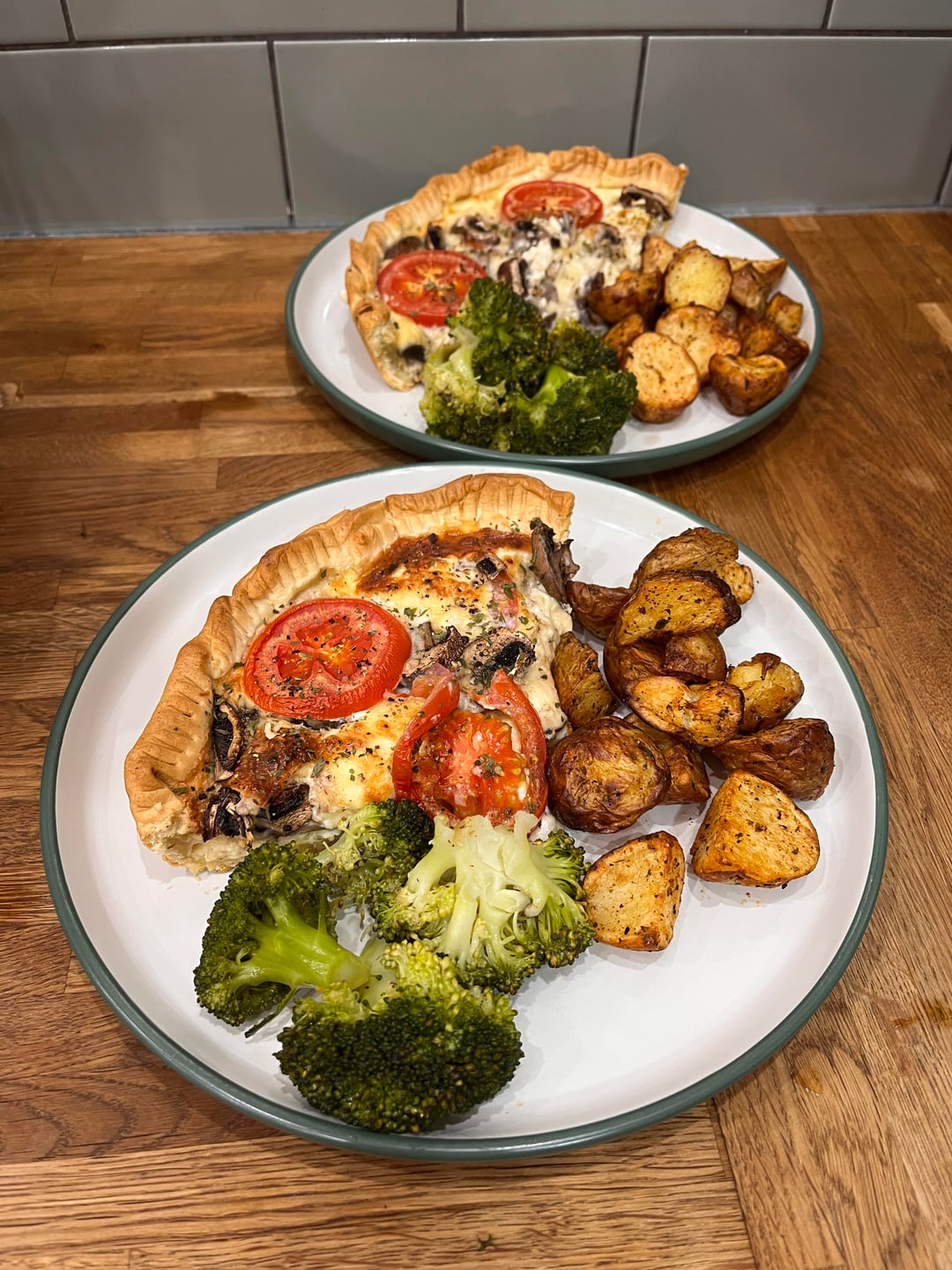 – quiche with mushrooms and tomatoes with roasted potatoes and broccoli