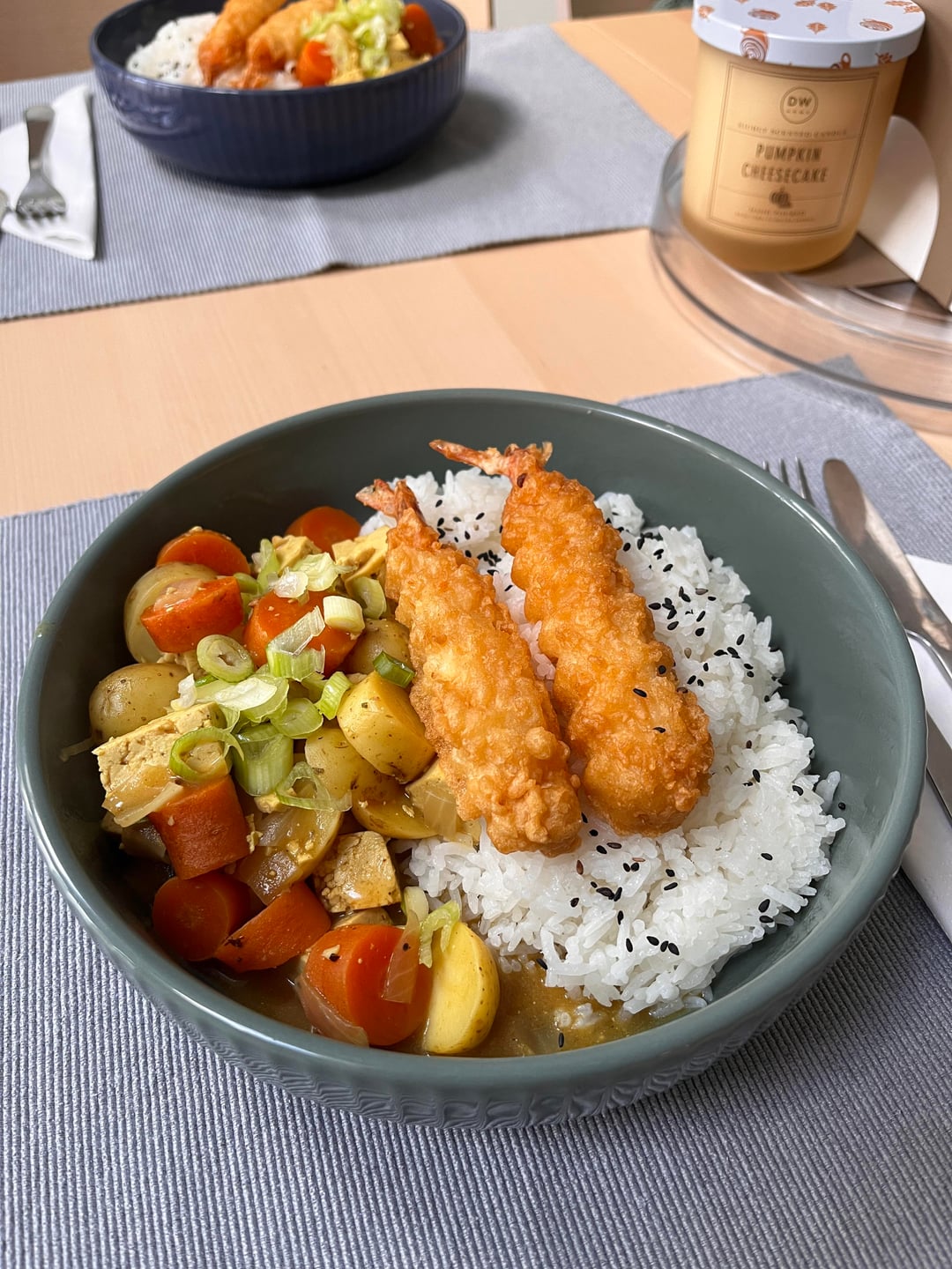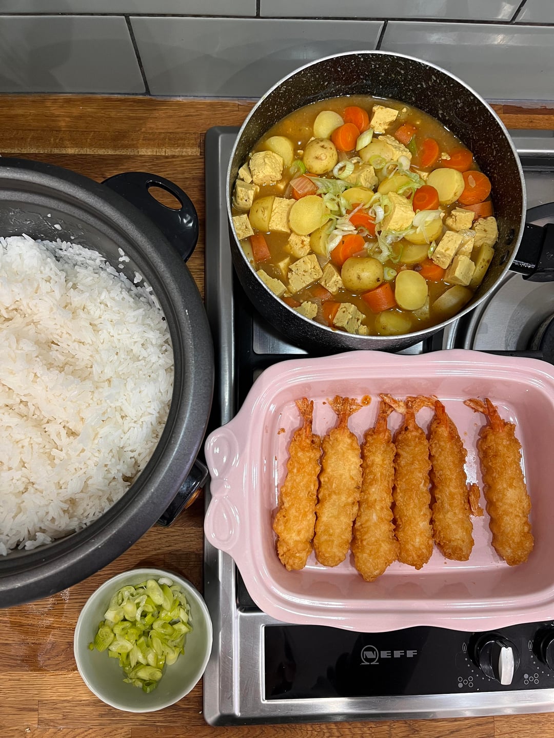 – japanese curry with potato, carrot, tofu, rice, green onions and shrimp tempura