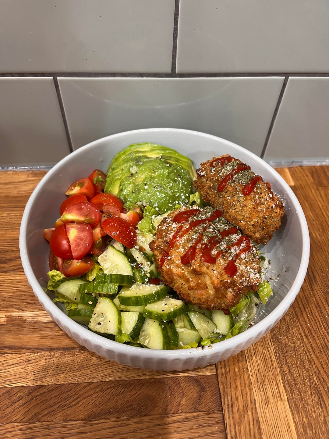 – fish cakes with romaine lettuce, cucumber, cherry tomatoes and avocado, topped with parmesan, sriracha and a homemade dressing