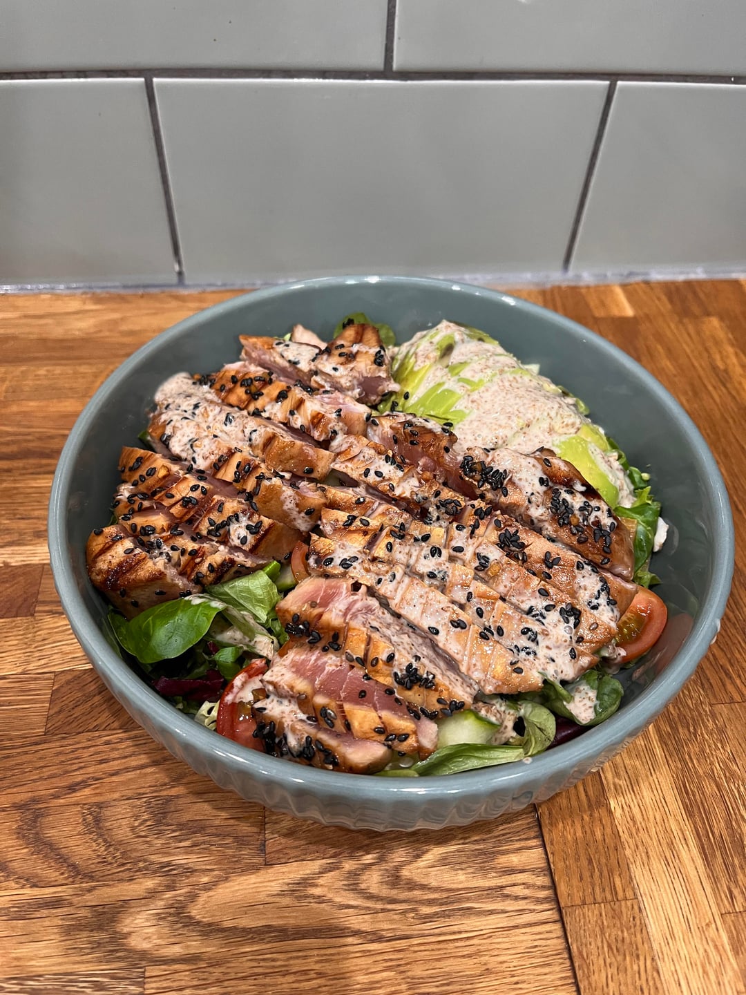 – teriyaki salmon bowl with jasmine rice, avocado, cucumber and sweetcorn topped with sriracha and furikake