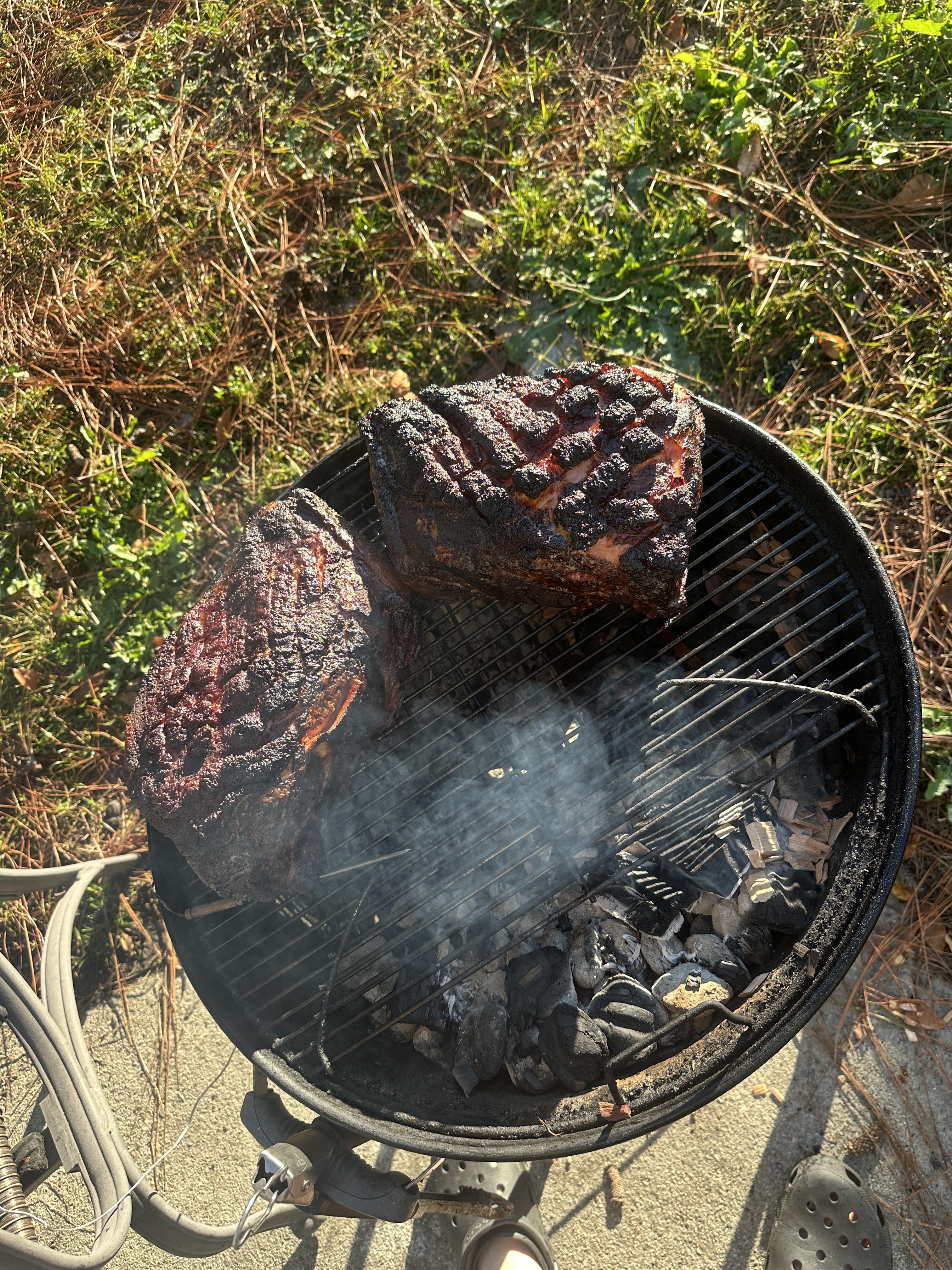 Started rolling smoke around 6am, hit the stall and wrapped around 2pm, pulled to rest at 4, served at 6. Killer Hogs AP and original, no binder.