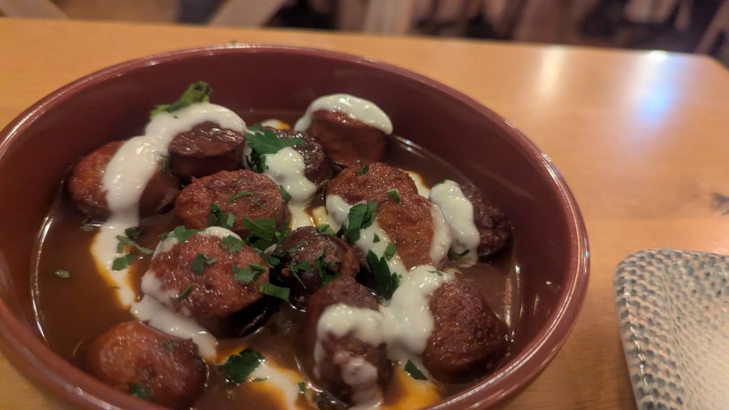 As a self-confessed meat fiend, I often go for the chorizo. However, the menu is not just for carnivores. The falafel and halloumi are both excellent, and the Padrón peppers and fried potatoes are perfect for sharing. For those not in a tapas mood, La Casa also offers two-person sharing boards and larger main courses.