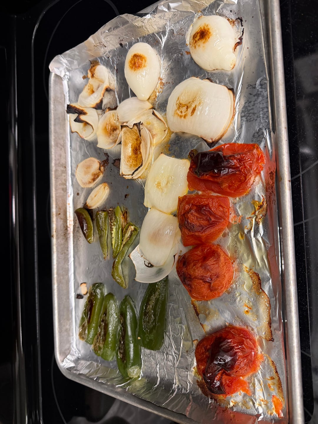 Decided to fire roast some veggies for my usual go to salsa. Definitely worth the extra time. I need to buy garlic, but I tossed in a lil garlic salt.