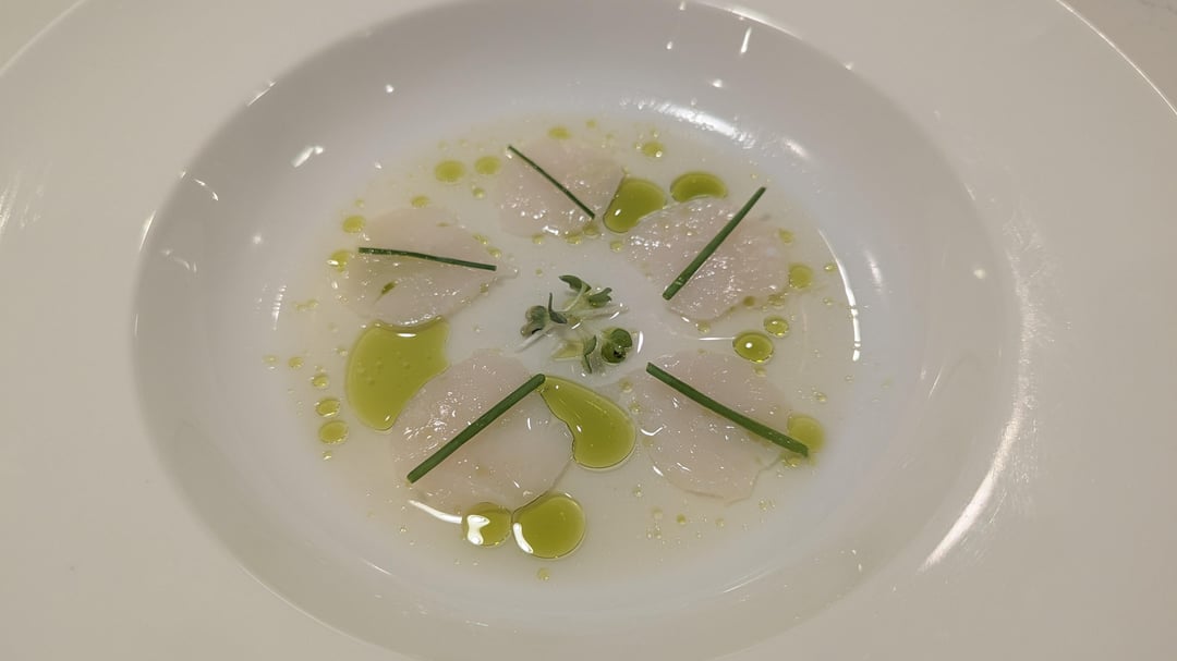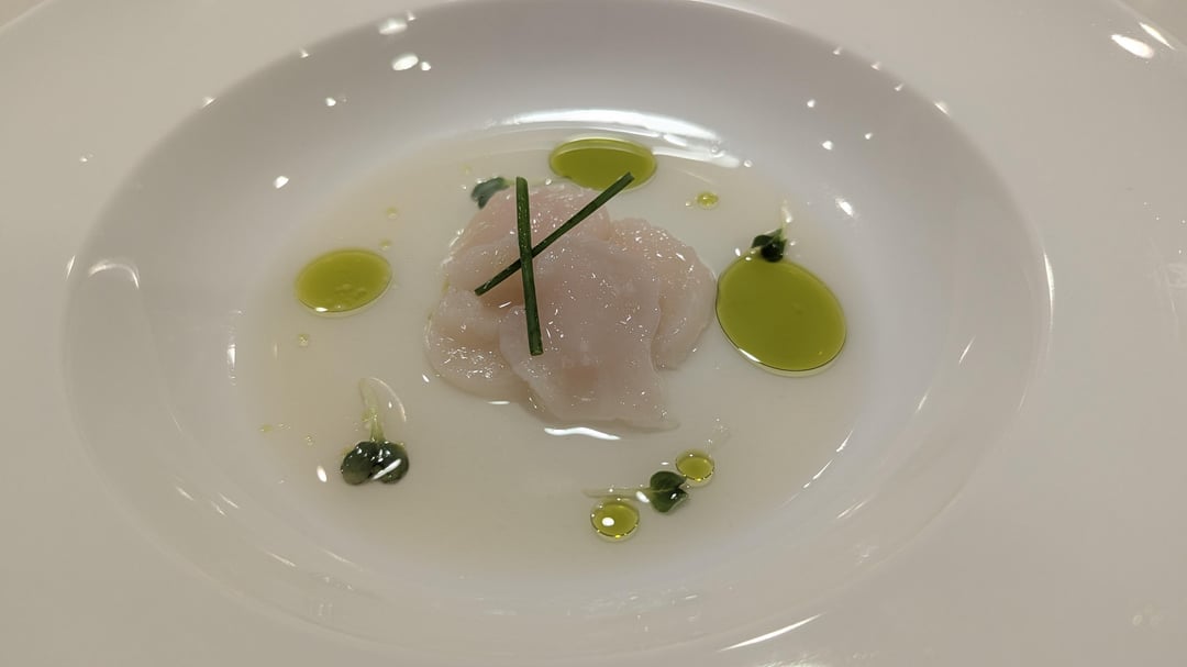I’ve got a couple bites: I’d lose the chive and go with a little bit more organically played greens or herbs, it looks too intentional IMO, if that makes sense. Also your herb oil should pop a bit more, the color looks muted