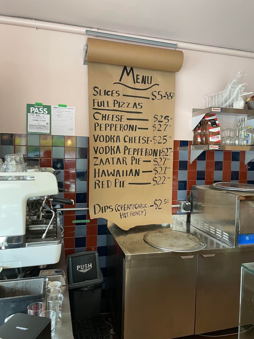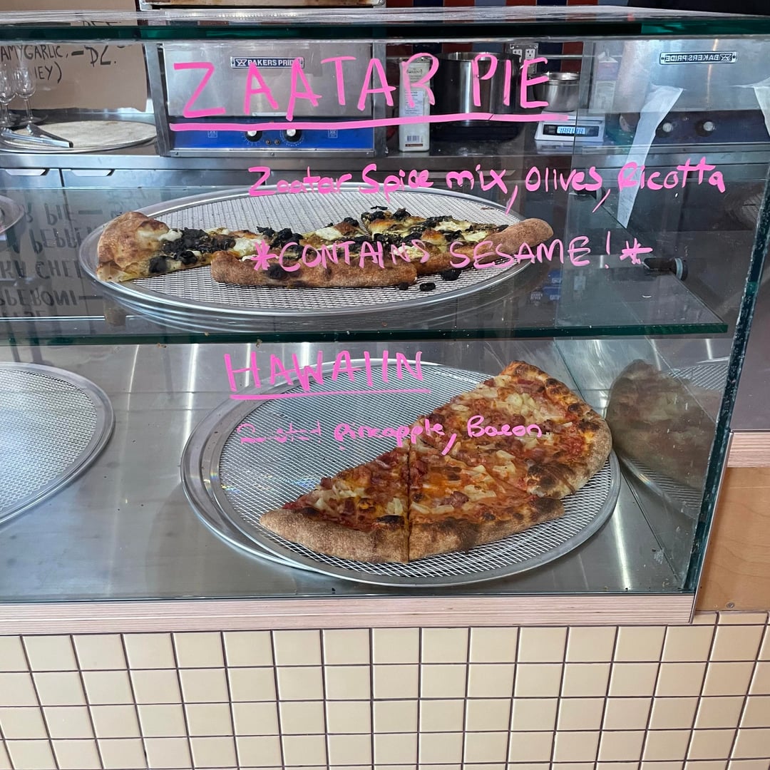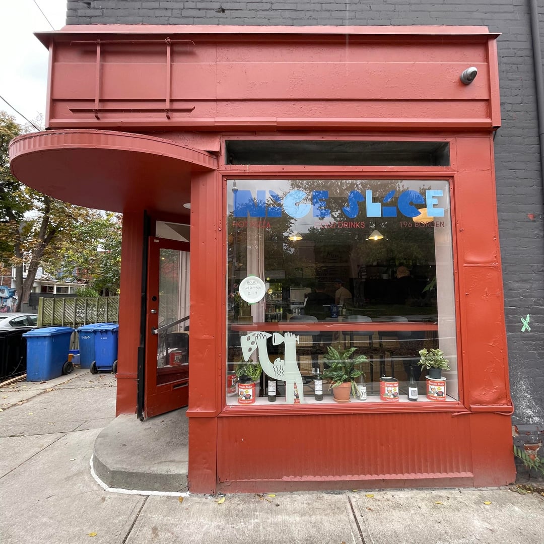 Thanks to u/Zoezer for pointing out new pizza spot Nice Slice a few weeks ago. It’s on Harbord right across from Emmer. Went today and got a slice ($5.55 each) of vodka pepperoni and zaatar. Not bad. Crust was a bit thicker than I like (my fave crusts are Badiali and Mac’s). But nice and crispy. The vodka sauce was really delicious. The zaatar could have used more zaatar seasoning as I mostly just tasted the black olives. Also liked the Slow Dance sparkling water. It’s lightly sweetened with honey and made in Toronto. First time seeing this. Also nice that they have around 10 small tables plus counter seating for eating in. Definitely beats nearby Pizza Gigi and Papa Ceo!