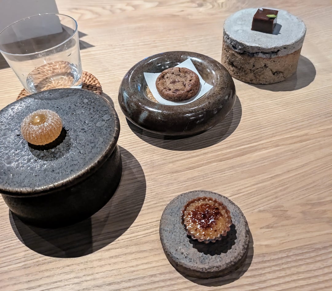 14. Egg custard tart, caramelised white chocolate fudge, chocolate and miso cookie, granny smith jelly