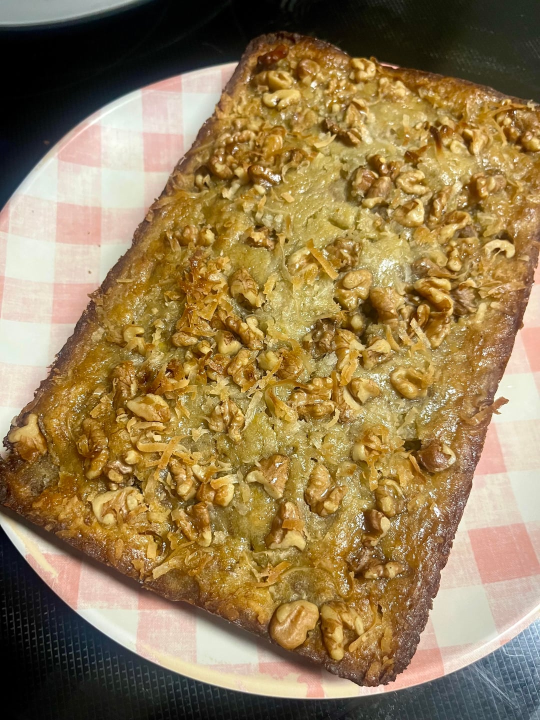 Recipe is pretty basic however I added coconut flakes, walnuts, and a honey butter mix on top. I wish I had a regular sized banana to use for scale. Can’s wait to make this again in another 3 years!