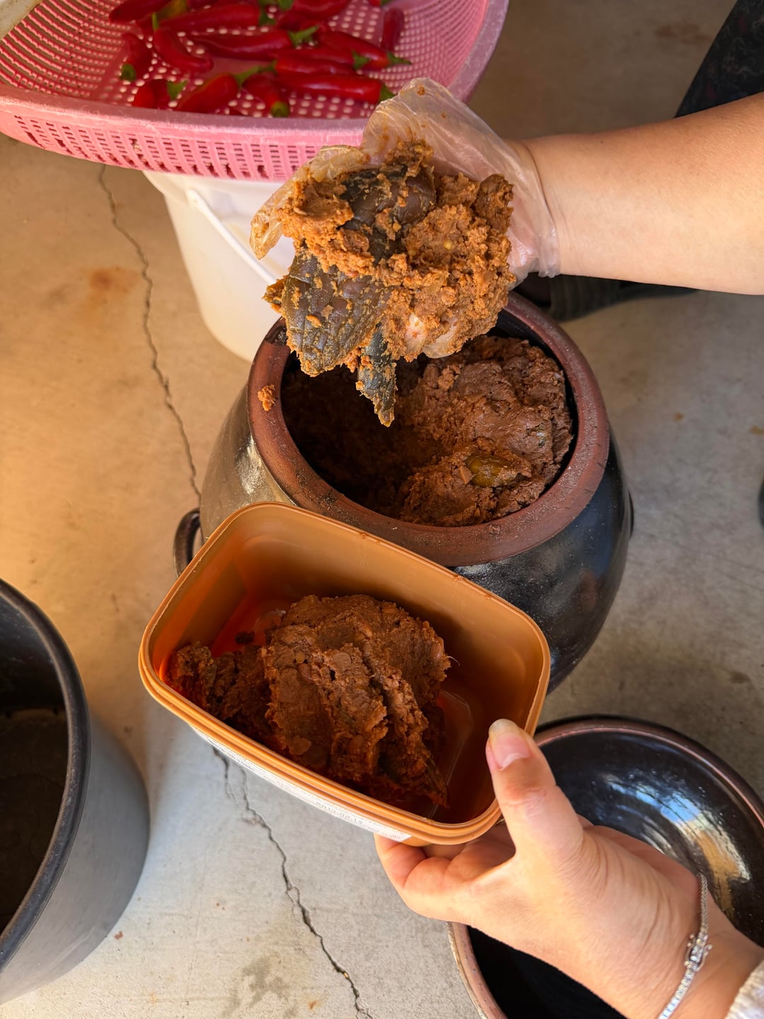 She growing red peppers to make 된장 which she ripens for a year in a pot before using it, sweet potatoes, some special kind of Korean onion and purella leaves. She manages this entire garden herself. Did I mention she’s 85? 😀