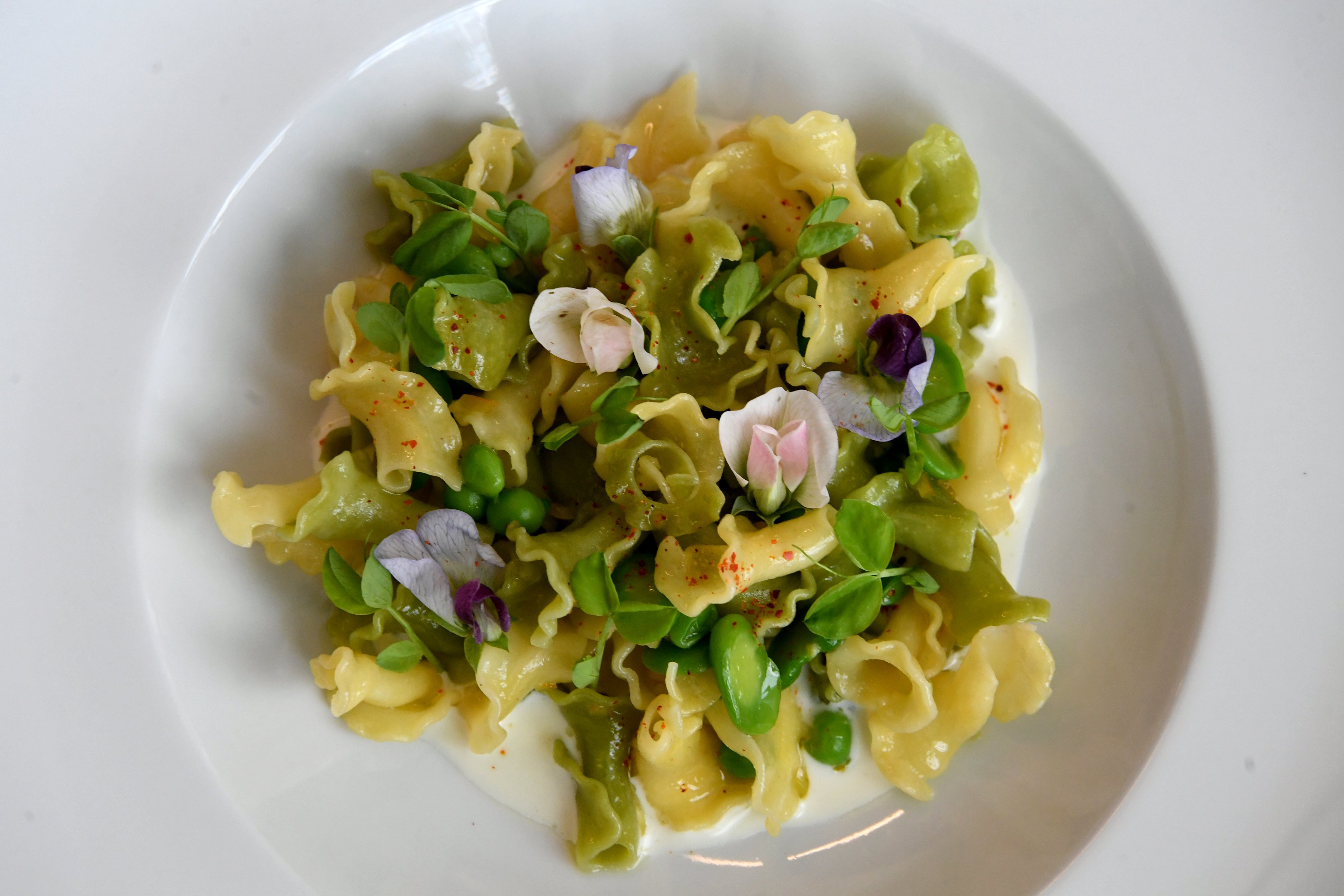 Green Peas Campanelle Pasta is photographed at One65 Bistro and Grill in San Francisco, Calif., on Tuesday, May 28, 2019. The restaurant is located on the second and third floors of One65, a 25,000 square-foot, multi-level French culinary destination that features four unique concepts, from casual to fine dining and a patisserie and bar and lounge. (Doug Duran/Bay Area News Group)