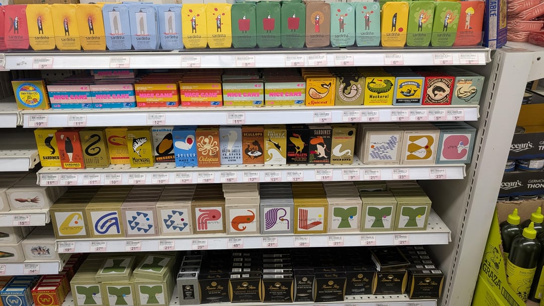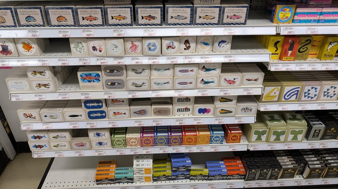trying to expand the image, managed to read one at the top, Faroe Island salmon, not much chance of finding any of those brands here in UK way beyond even Amazon and their inflated prices