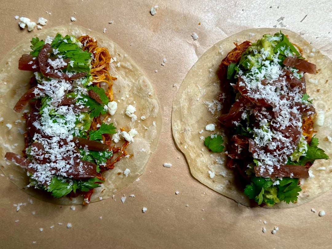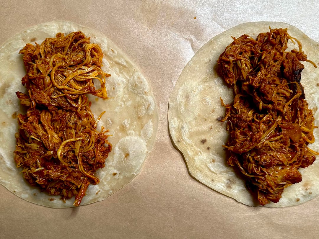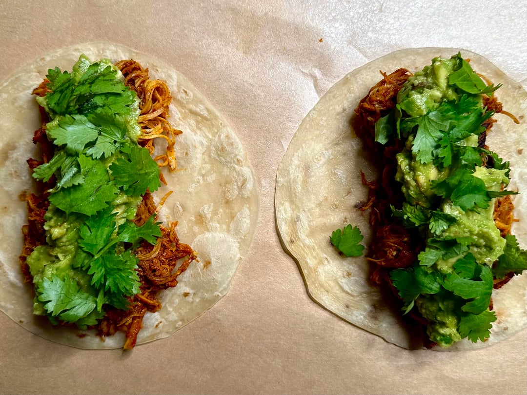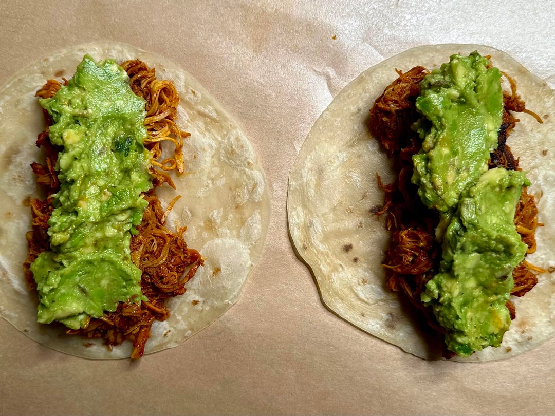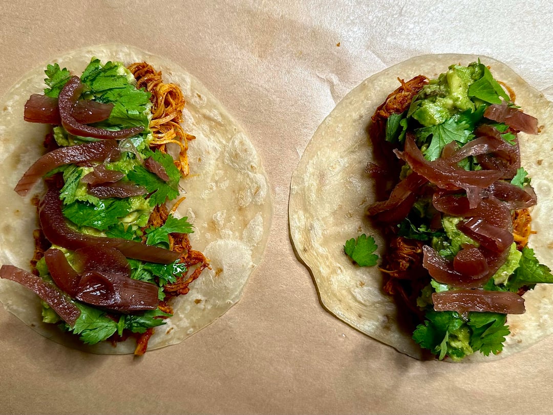 I made a batch of pollo Pibil (Mexican shredded chicken) in the pressure cooker. Some nice Sonoran flour tortillas, a pile of the Pibil, some seasoned smashed avocado, pickled red onions, cilantro, salsa verde, Marie Sharp’s Red habanero hot sauce, and some grated Cotija cheese.