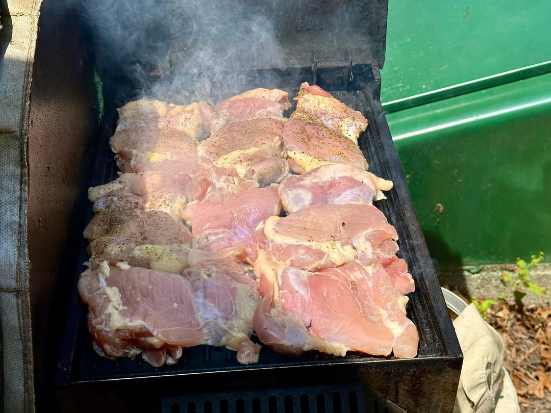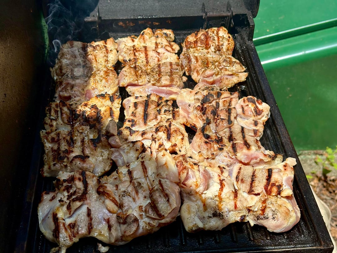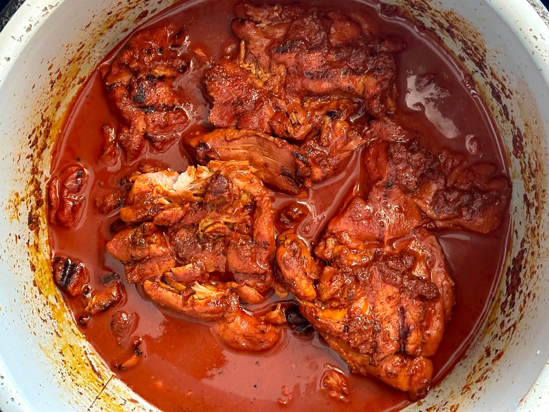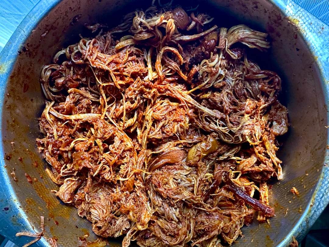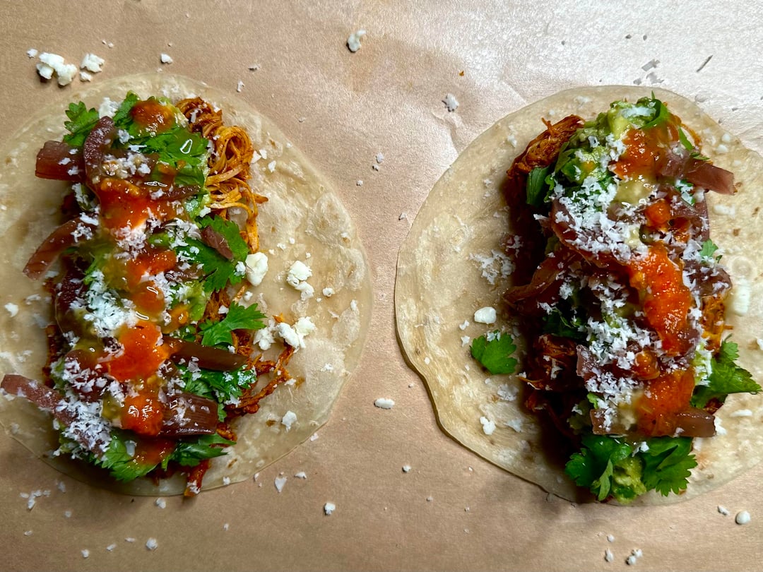 I made a batch of pollo Pibil (Mexican shredded chicken) in the pressure cooker. Some nice Sonoran flour tortillas, a pile of the Pibil, some seasoned smashed avocado, pickled red onions, cilantro, salsa verde, Marie Sharp’s Red habanero hot sauce, and some grated Cotija cheese.