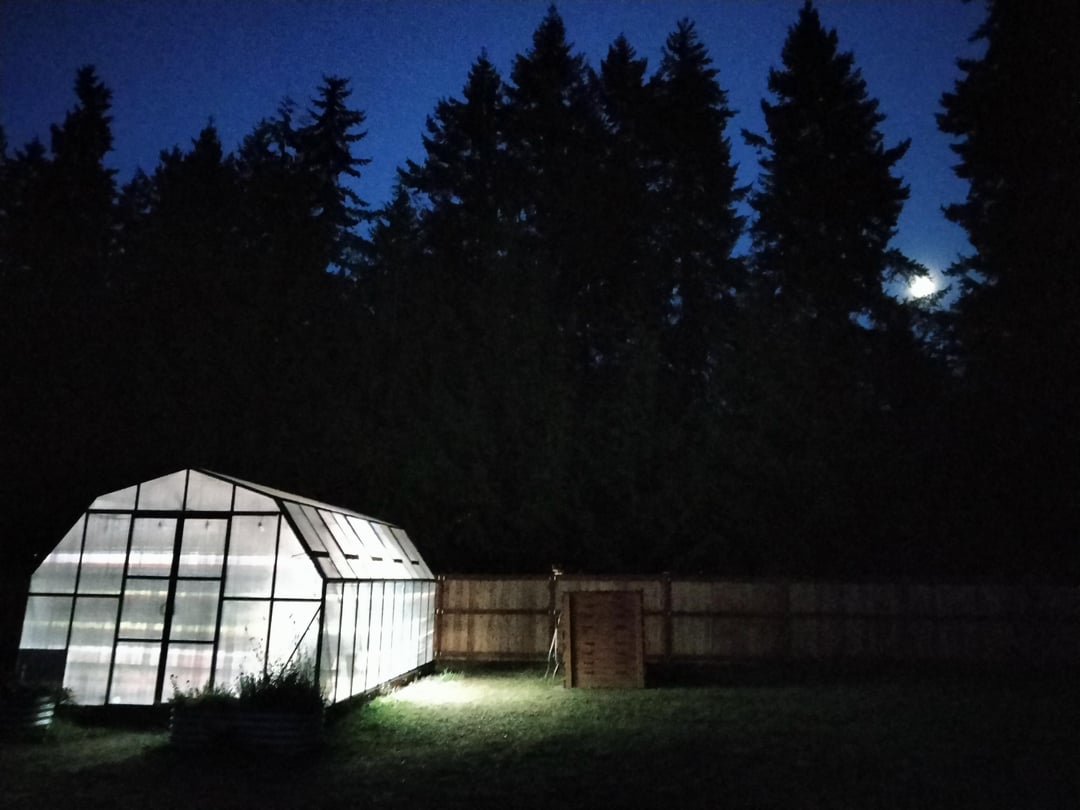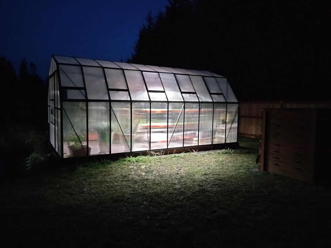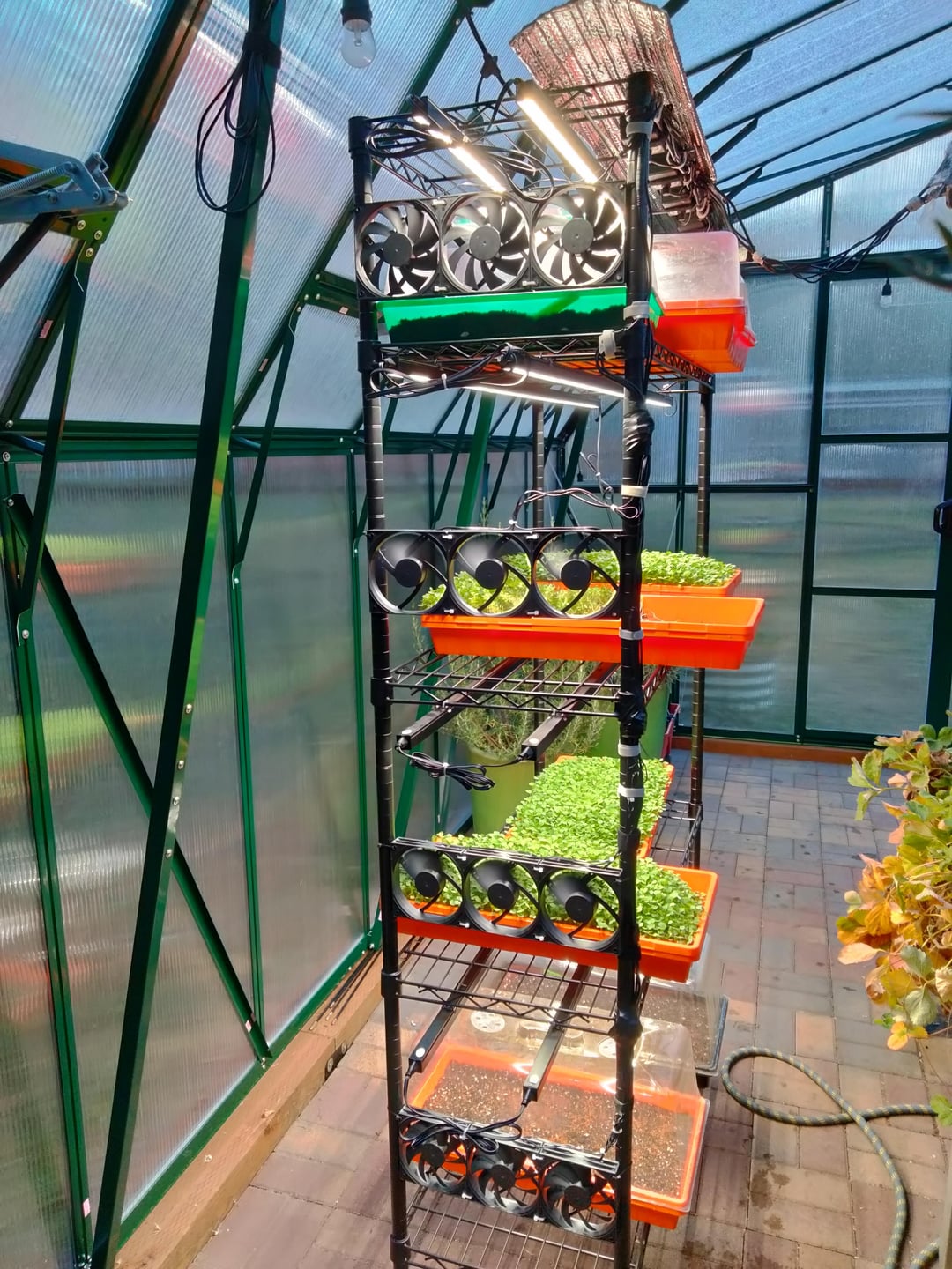 Very cool, good job on cord management! Can you tell me about your lighting and fan setup? Was the floor/brick there before the greenhouse? Looks great btw