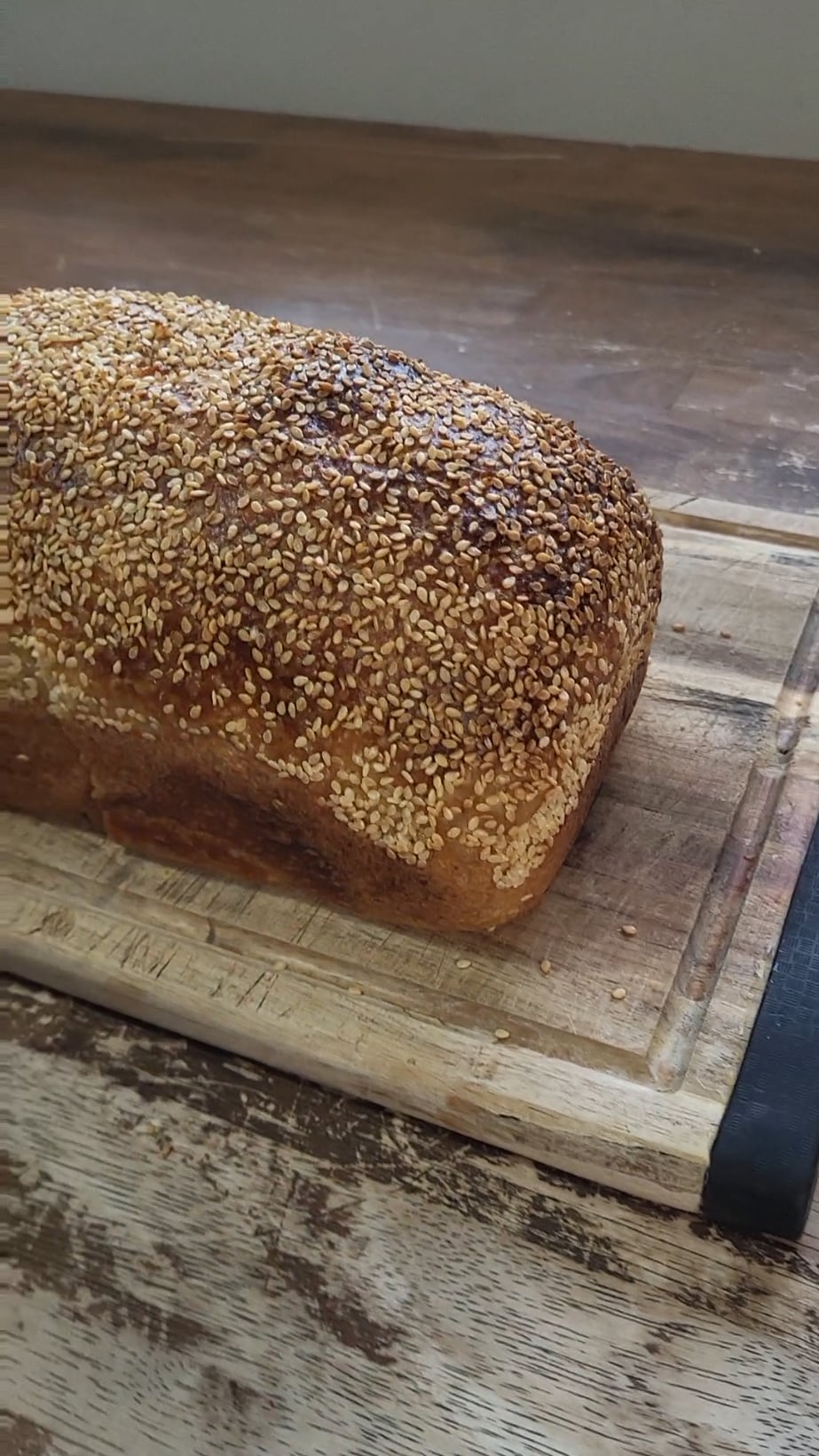 FYI I skipped the cold proof this time and sprinkled with sesame seeds after shaping… I did a 2 hour room temp proof instead. Usually I will score the bread after the first 7 minutes of baking but I forgot. I kinda like the outside like this, kinda looks like a big pretzel 🥨.