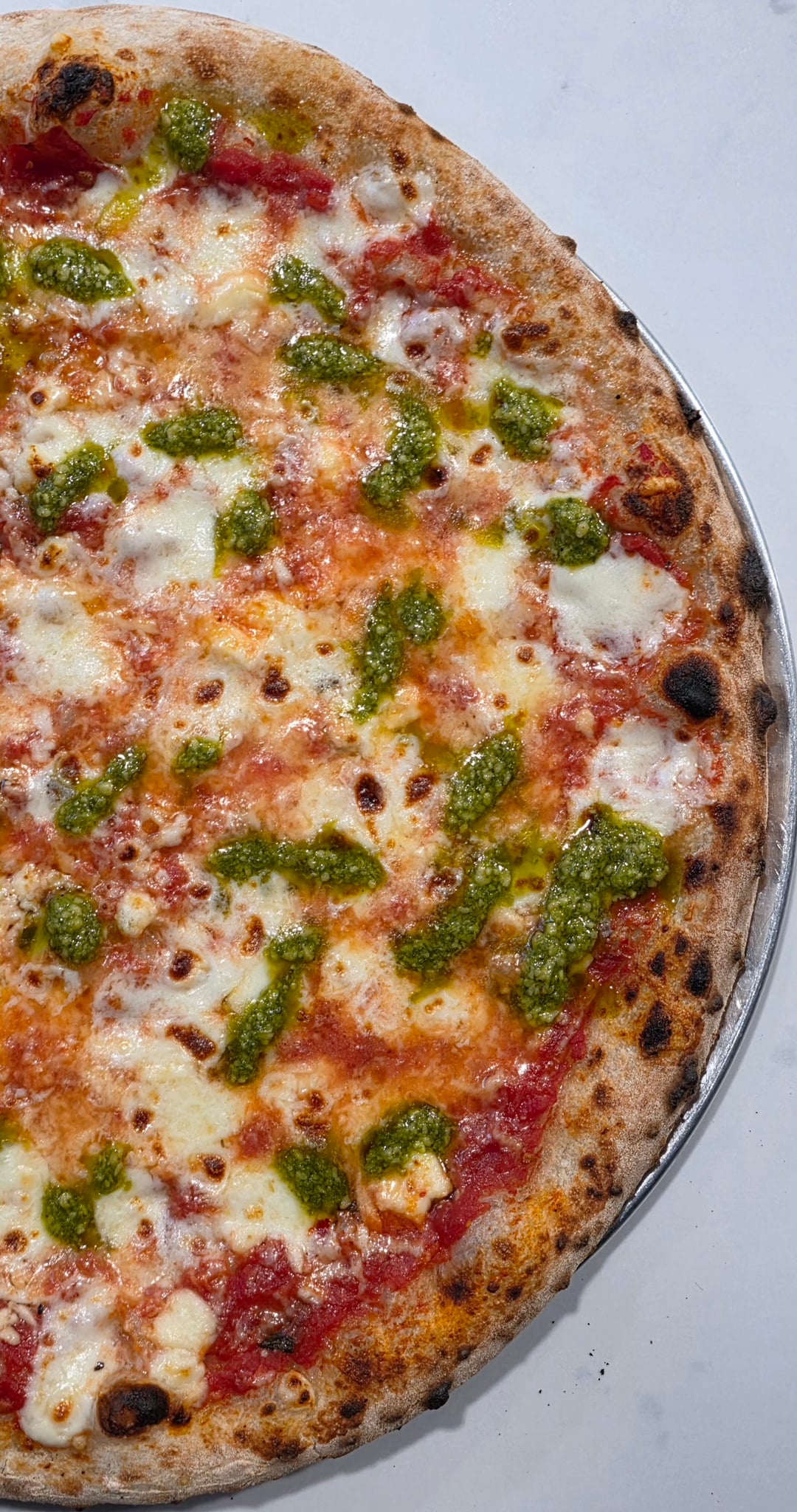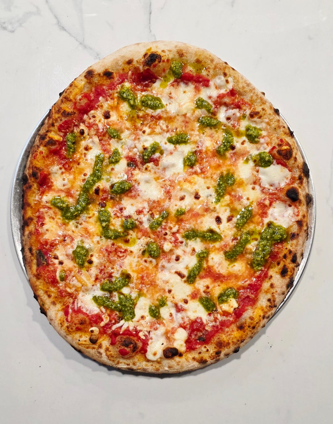 This was a three week old frozen dough ball so not much poofy but still delicious.Neapolitan style, 67% hydration baked at 923F in the Gozney Arc XL. Pesto was added post-bake, the combo was outstanding.by dreamer_r21 Dining and Cooking
