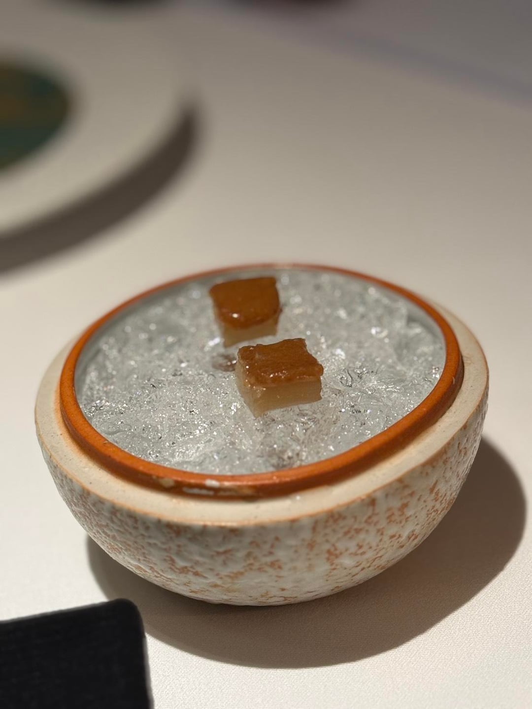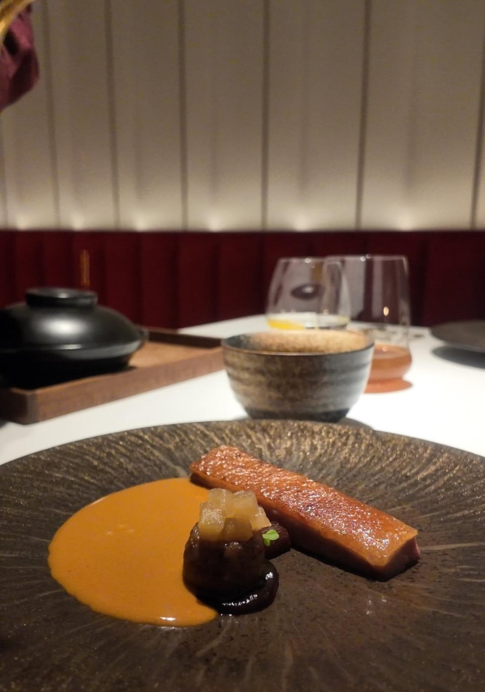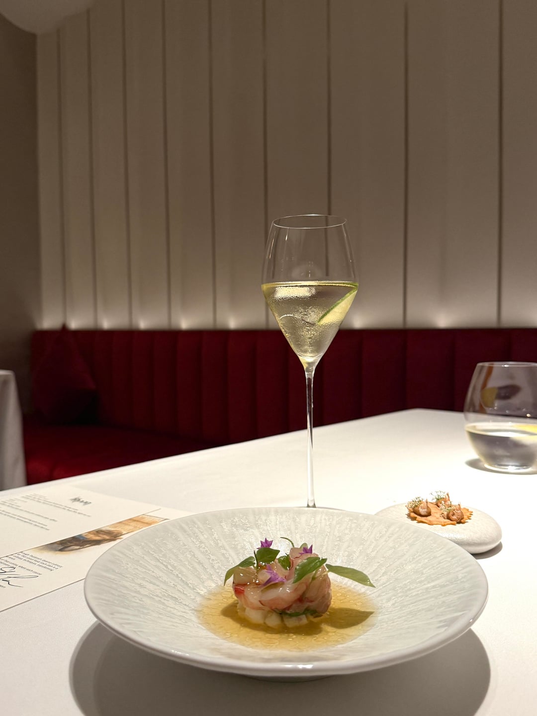 Next came the Andaman Tiger Prawn dish, which leaned into bright, sour notes — super refreshing and aromatic. It reminded me of goong chae nam pla (raw shrimp in fish sauce) in a refined, elegant way.