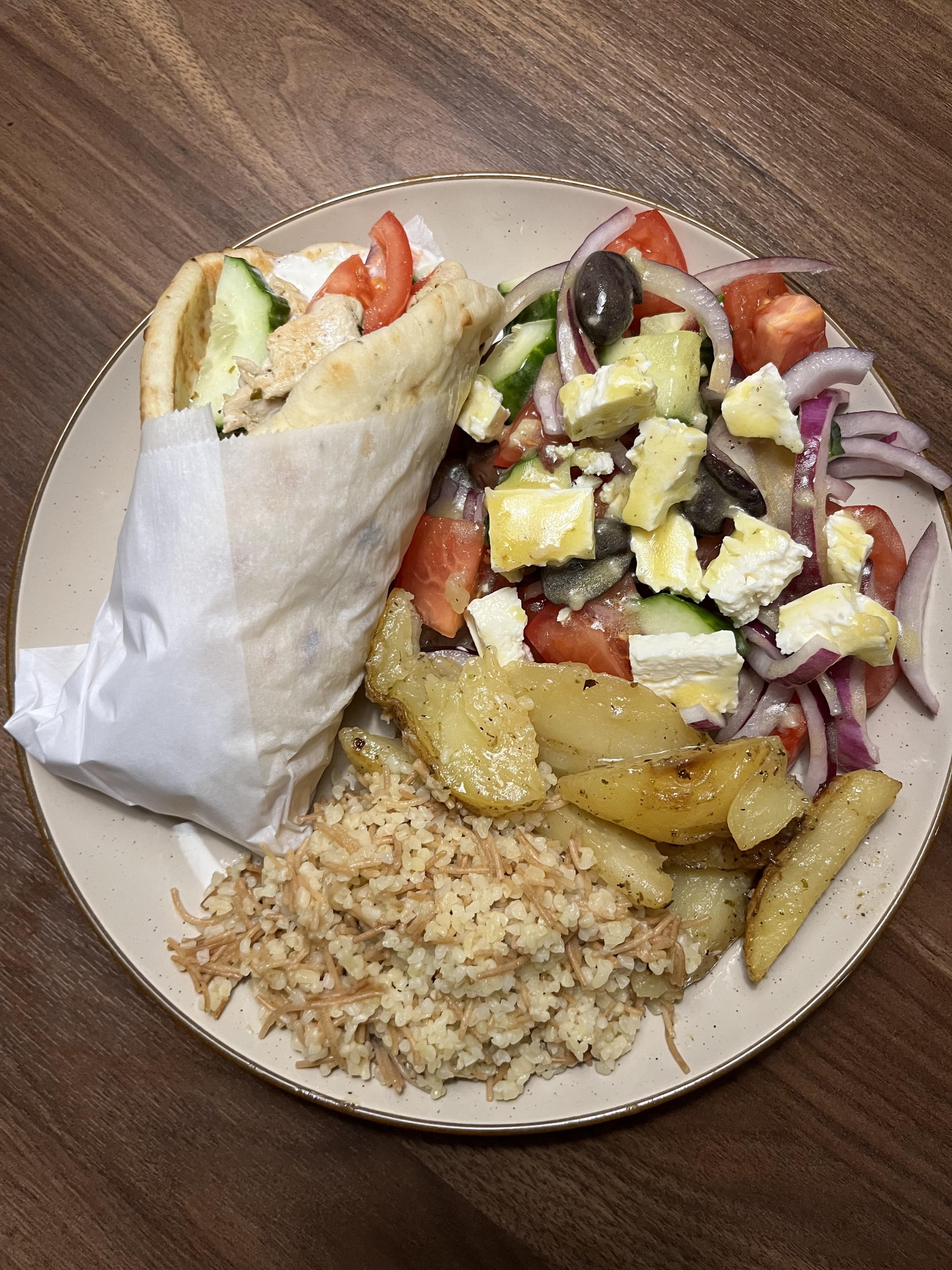Chicken souvlaki wrap with greek yogurt tzatziki, bulgur, greek potatoes and greek salad