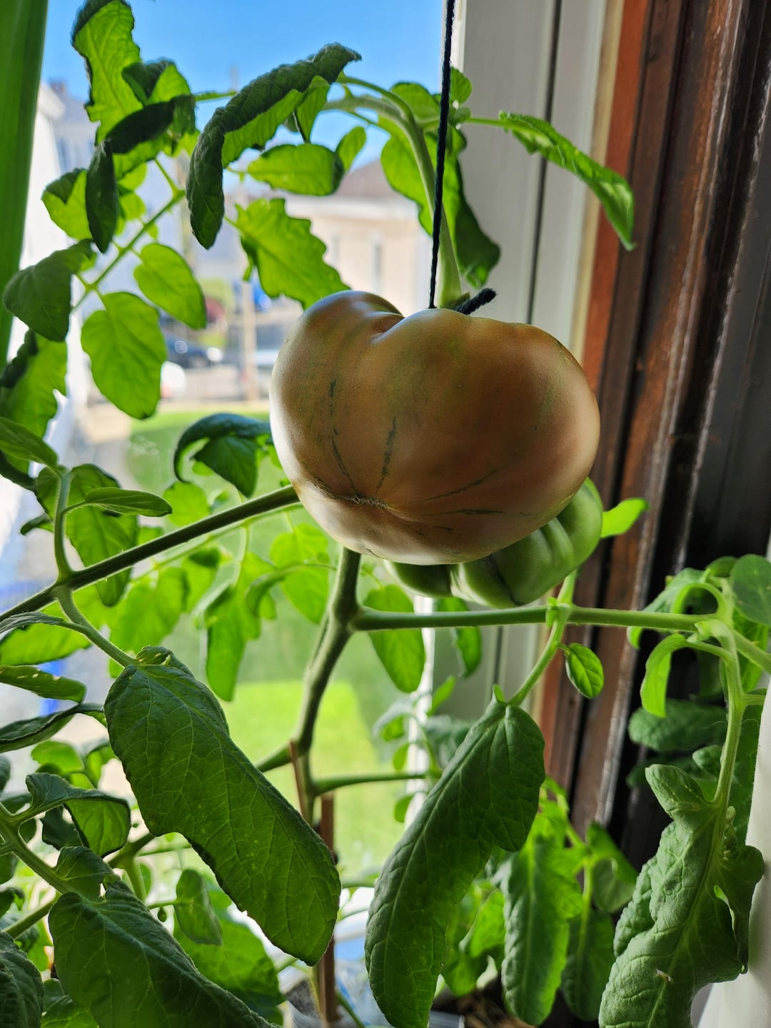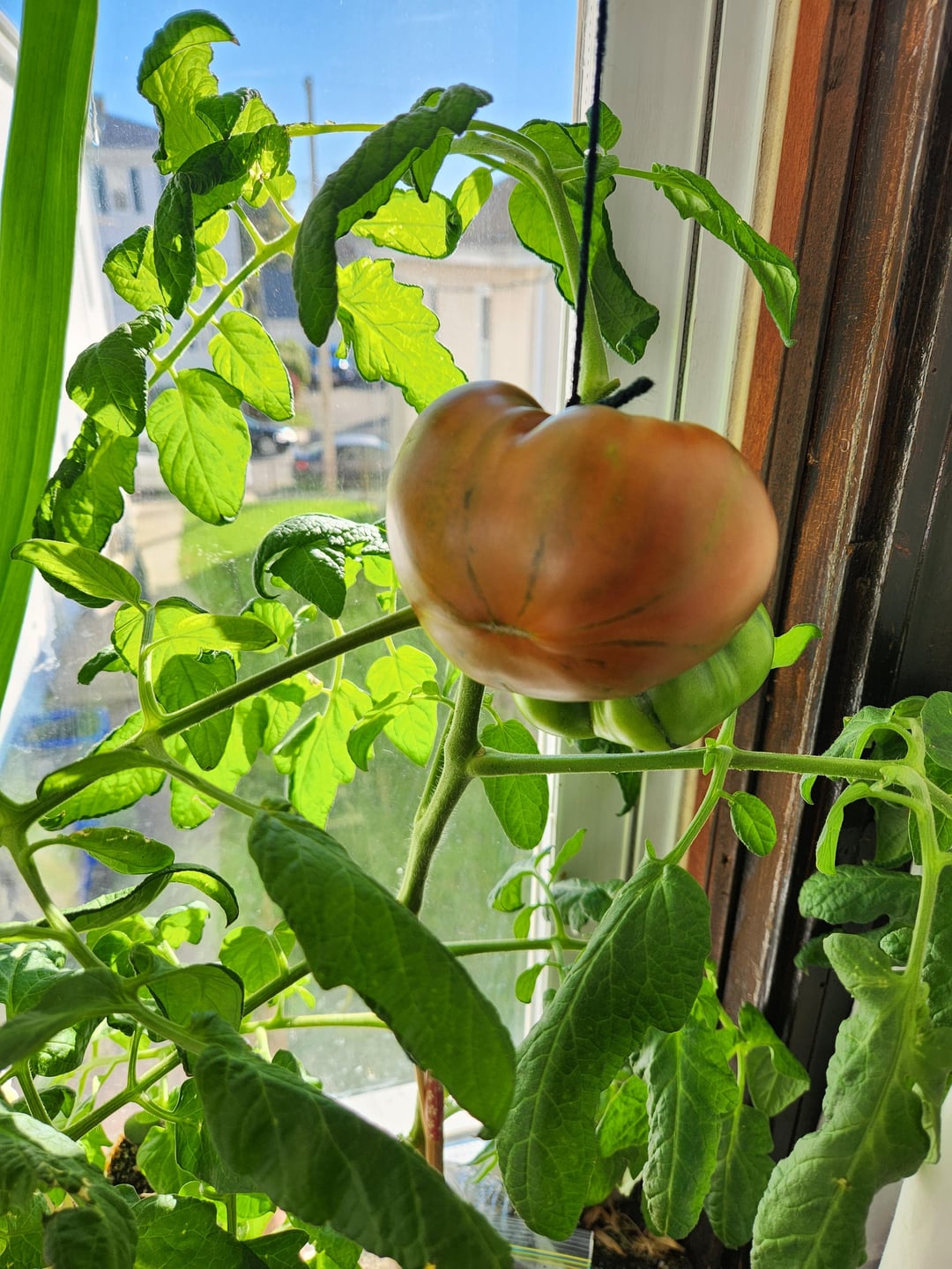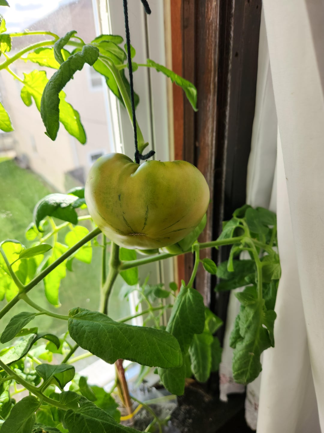 Hello fellow tomato lovers! I'm growing a heirloom tomato i grabbed from the store, bit they weren't labeled. Anyhow, I did what we all do… I got curious if the seeds would be any good. Needless to say that was a yes, and I grew this in a tiny container in my windowsill. There is a 2nd tomato that's still currently green and growing still.