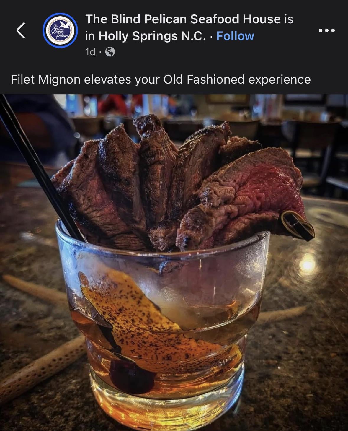I’m close by in Raleigh, and if someone did this in a downtown restaurant, I honestly don’t think they’d sell more than like three. Floating pieces of fat in an old fashioned, and meat that tastes like liquor is just not appealing to me.