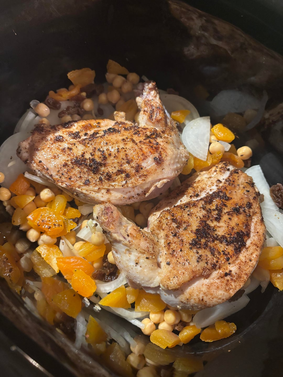 In the slow cooker layer one small sliced onion, 2-3 cloves of garlic, then golden raisins (1/4 cup or however much you’d like), roughly chopped dried apricots (again 1/4 cup, or however much you want – I like more), 1 cup rinsed chickpeas. Nestle the seared chicken in this. Add 1/2 cup of chicken broth (don’t pour it over the chicken, pour around it).