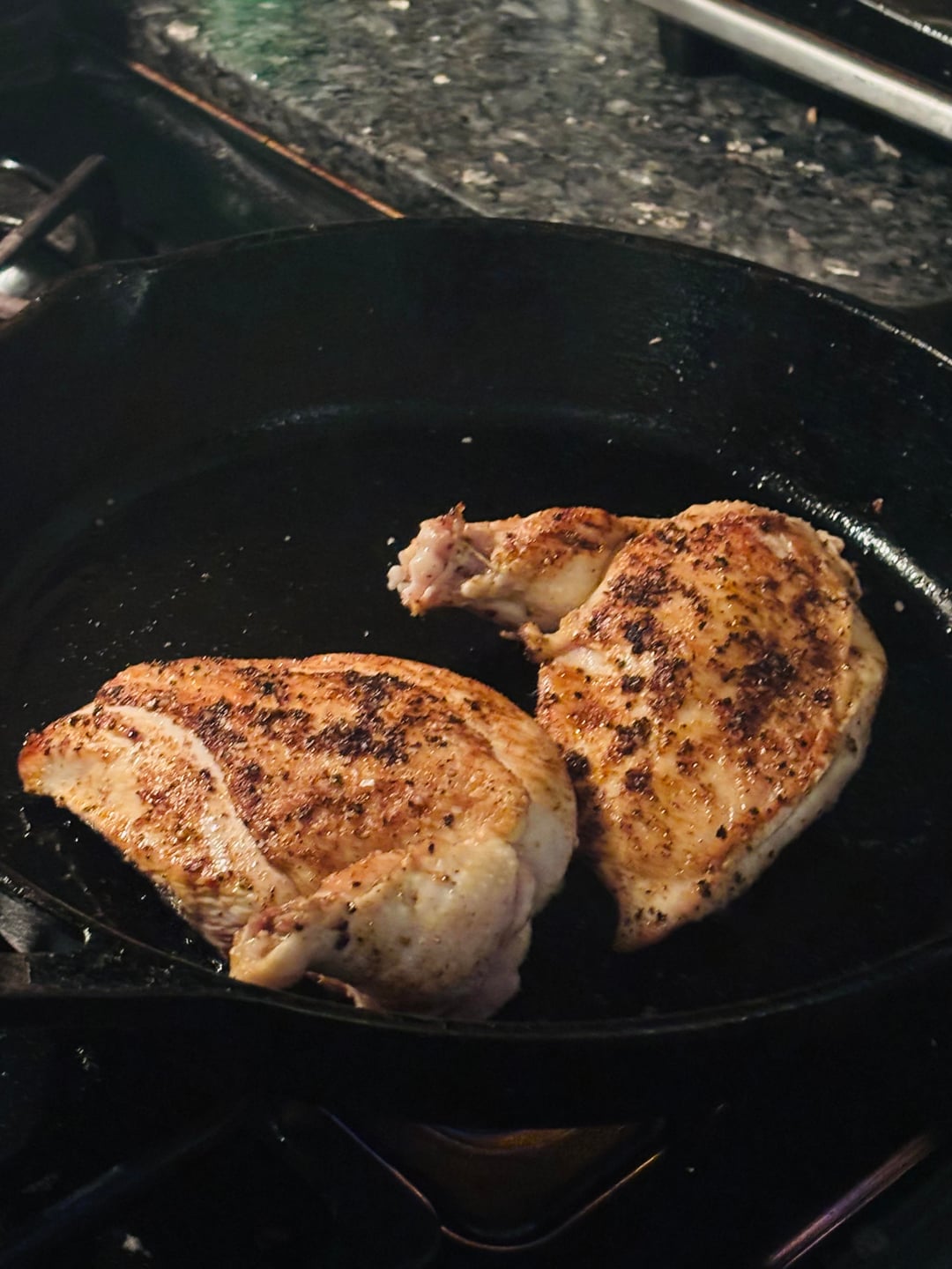 Season chicken with salt, pepper, 1 tsp cumin, 1 tsp smoked paprika (I have a smoked paprika, garlic, chive mix I like). Sear in cast iron in oil (I used avocado) for about 3 mins skin side down, then two minutes opposite side. Set aside.