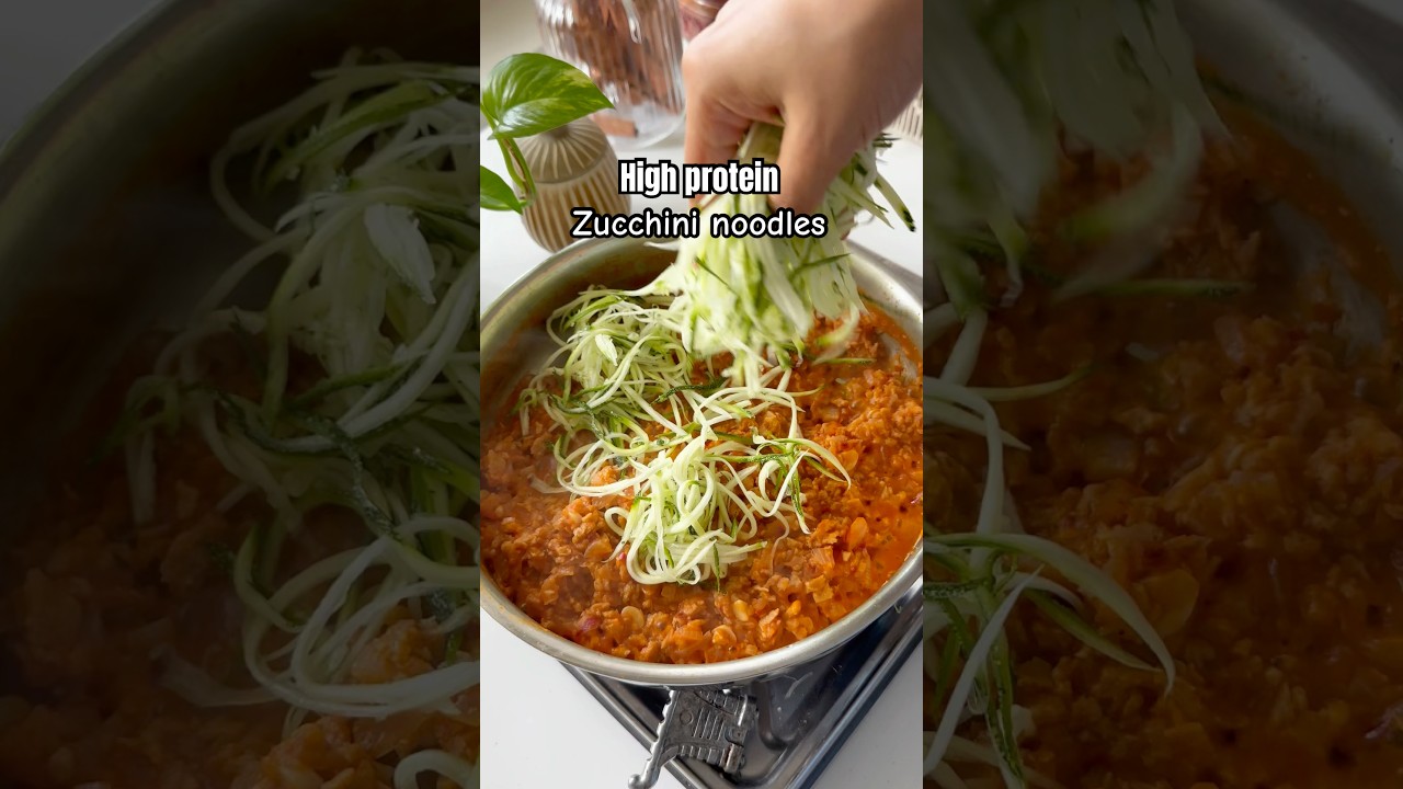 If you’re trying to eat healthy and lose weight, you should try this high protein zucchini noodles that gives you around 28 g of protein under 330 calories. To make this, boiled tomatoes. Now, blend this into a smooth puree. Next, slice zucchini into thin strips like this. And next, heat oil in a pan. Add garlic, onion, saute on high heat. Now, I’m using some soya granules for protein here. You can use any protein of your choice. Followed by the tomato puree. Add some spices. Let this cook. And finally add the zucchini strips to it. Now cook this on high heat for a minute and then serve it hot.
