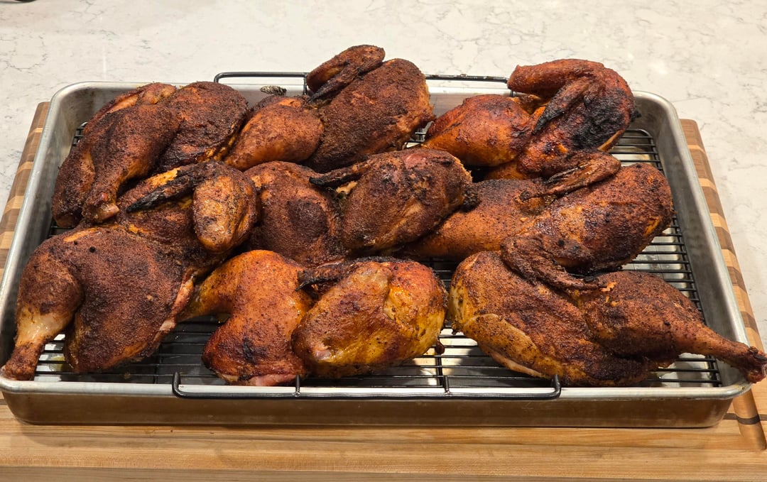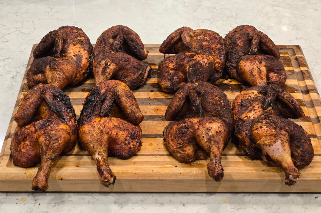 And, yes, 4 whole chickens can fit on the outer ring with a vortex in the middle. Cooked at 350-400 with a mesquite and apple chunk and done in only about 1 hr. Crispy skin, smokey flavor, and juicy meat, even the breasts.