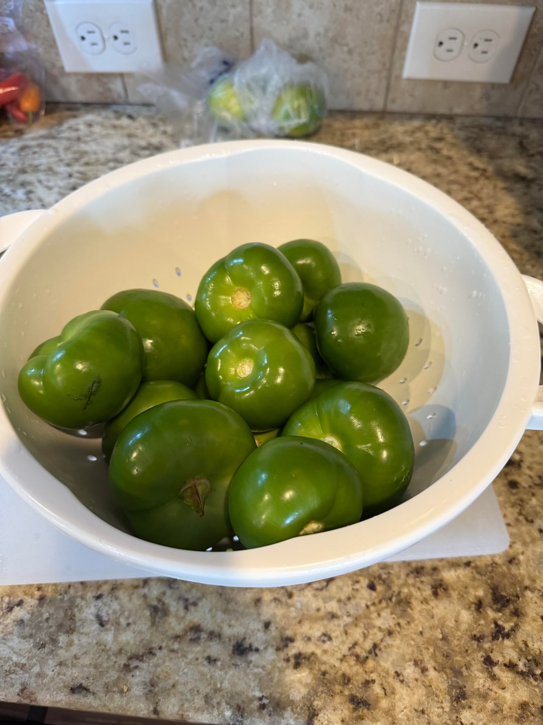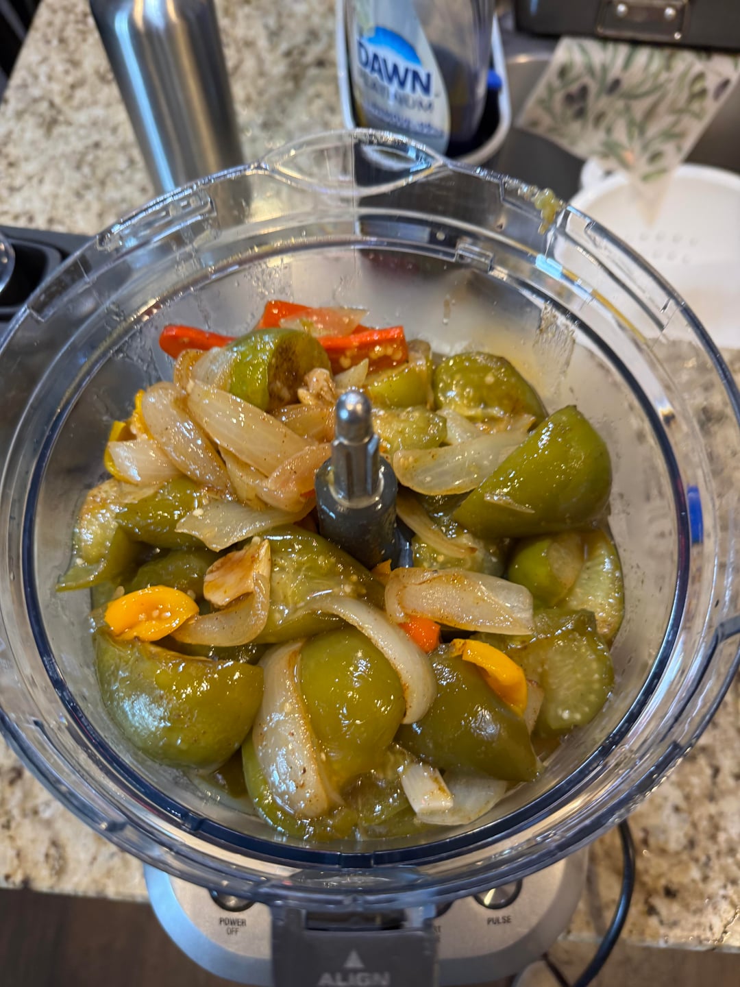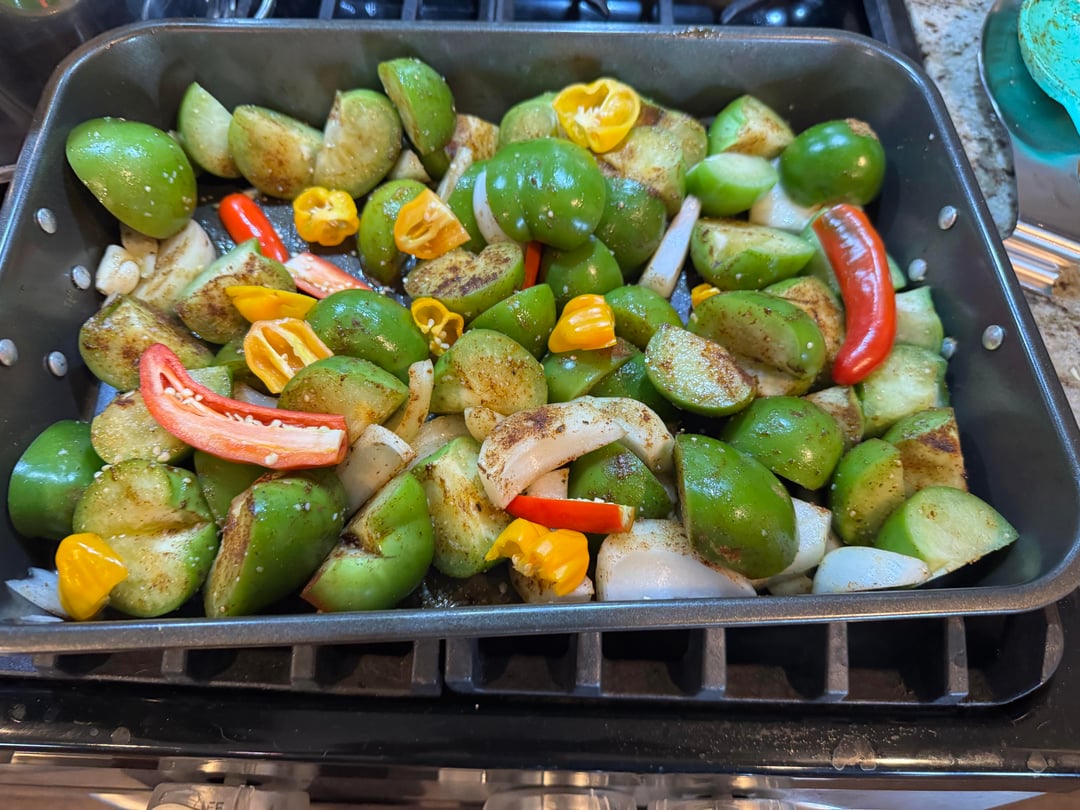 One sweet yellow onion, 5 smashed cloves of garlic, 2.5lb tomatillos, and peppers in a roasting tray with salt, pepper, olive oil, cumin, and chile powder. Roasted at 400 degrees for 20 minutes on the outdoor gas grill. Put in the food processor with the leaves from half a bunch of cilantro and the juice of 2 limes.