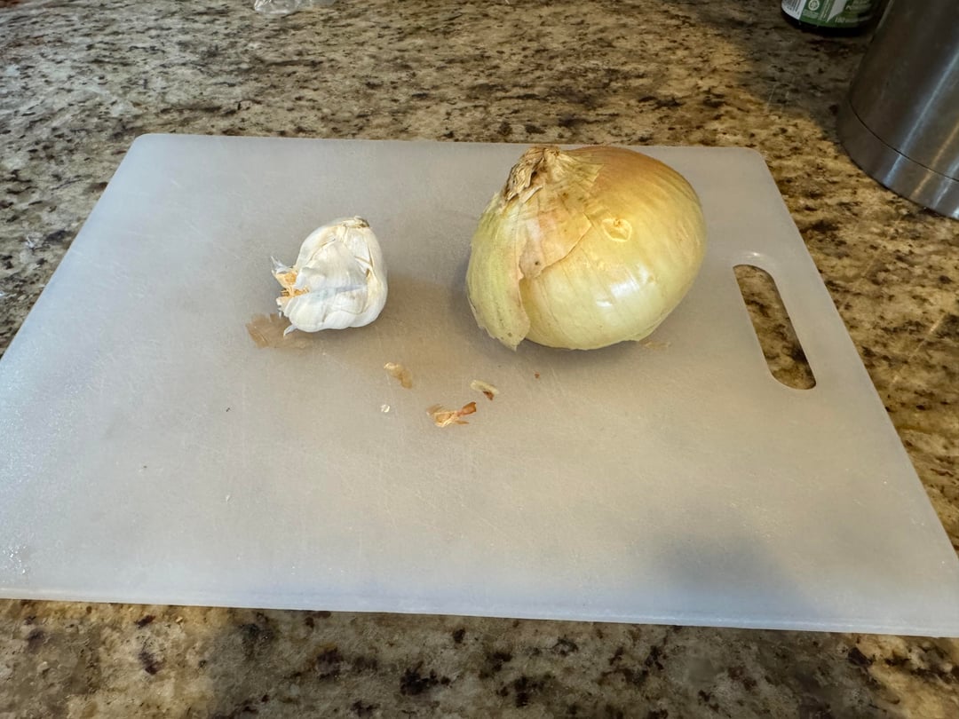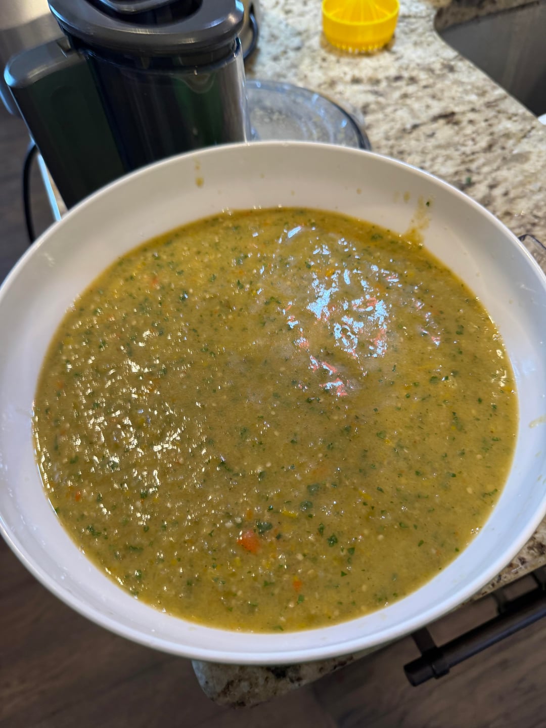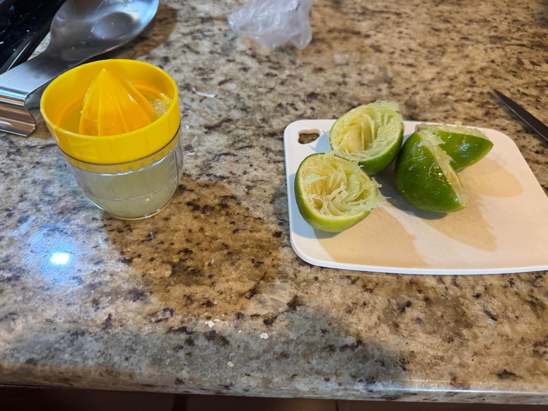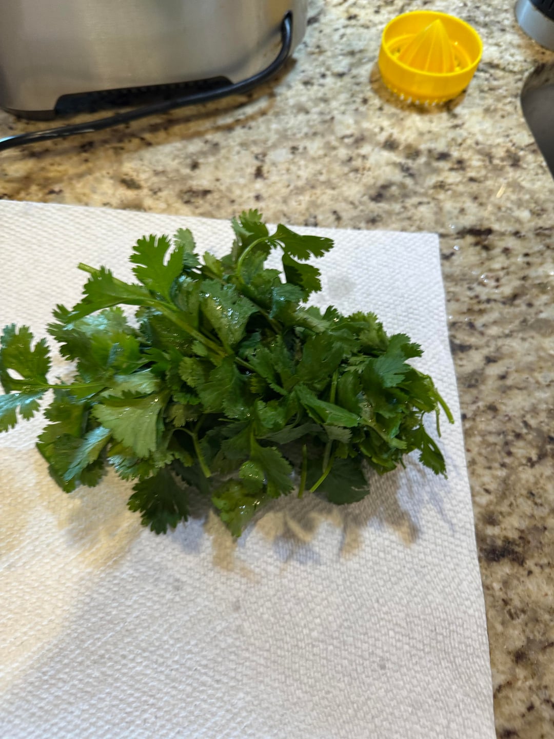 One sweet yellow onion, 5 smashed cloves of garlic, 2.5lb tomatillos, and peppers in a roasting tray with salt, pepper, olive oil, cumin, and chile powder. Roasted at 400 degrees for 20 minutes on the outdoor gas grill. Put in the food processor with the leaves from half a bunch of cilantro and the juice of 2 limes.