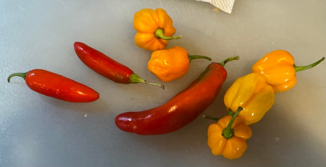 Probably the last salsa of the year. Home grown Scotch Bonnet, Habanero, F1 Garden Salsa, and Serrano peppers.