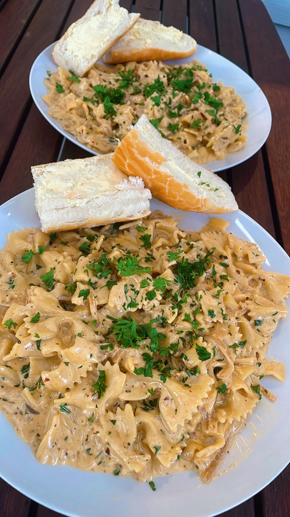 RealJackJones 1 week ago Recipe (all in one pan):*I go with intuition and feel when it comes to amounts sorry*– Add oil and butter to pan on low and melt down– Add onion (plenty of it), smoked paprika and cook slow and keep covered (this part takes the longest, up to an hour)– Once onion is caramelised, add chill oil and garlic and cook down– Begin cooking Farfalle pasta (salted water)– Add cream, parsley, salt and pepper, parmesan, Italian herbs and stir through– Add a couple of ladles of pasta water and cook down– Add pasta and stir through– Garnish with fresh parsley and serve with a side of bread and / or salad
