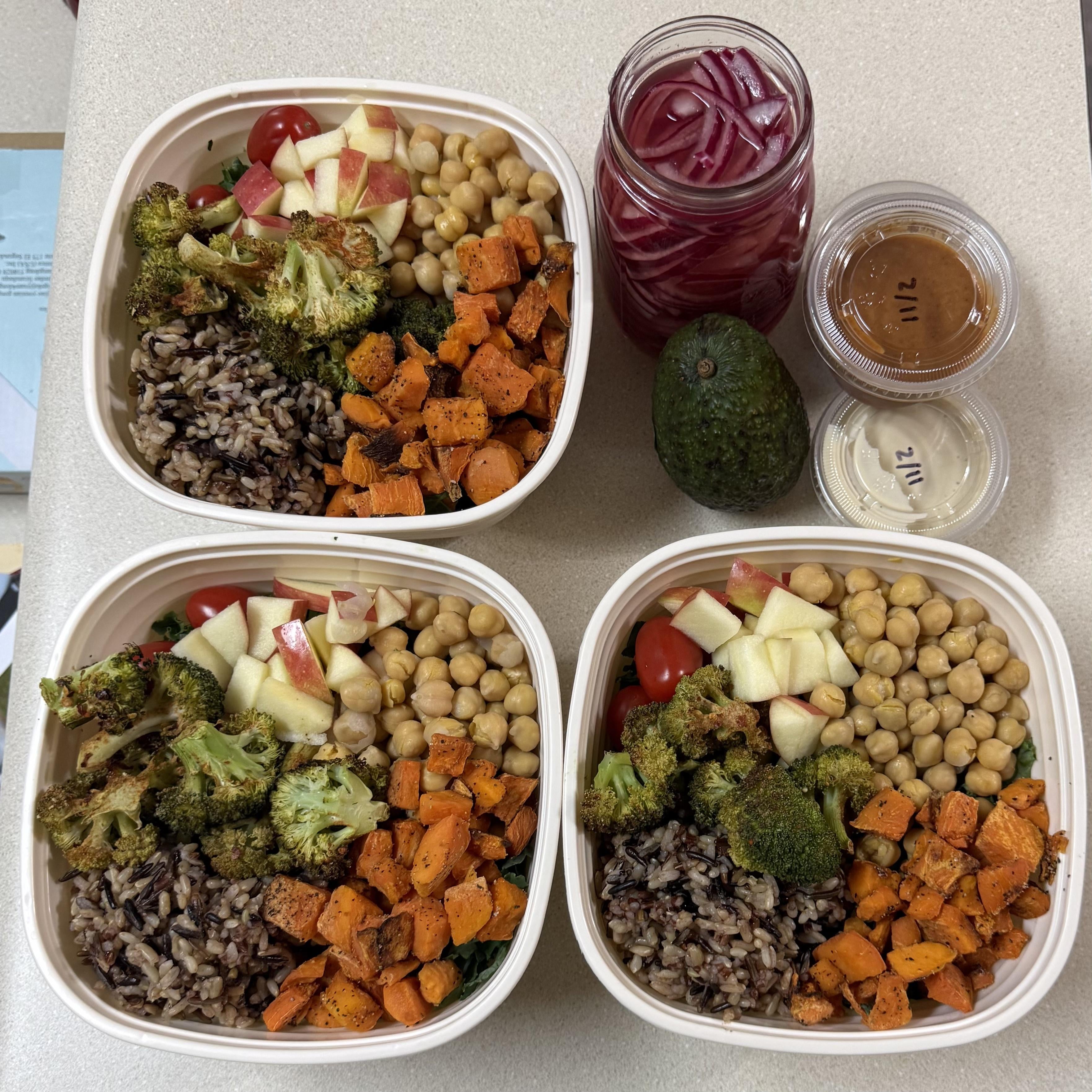 – Kale, wild rice, spicy broccoli, tomatoes, apples, chickpeas, sweet potato, pickled onions, avocado