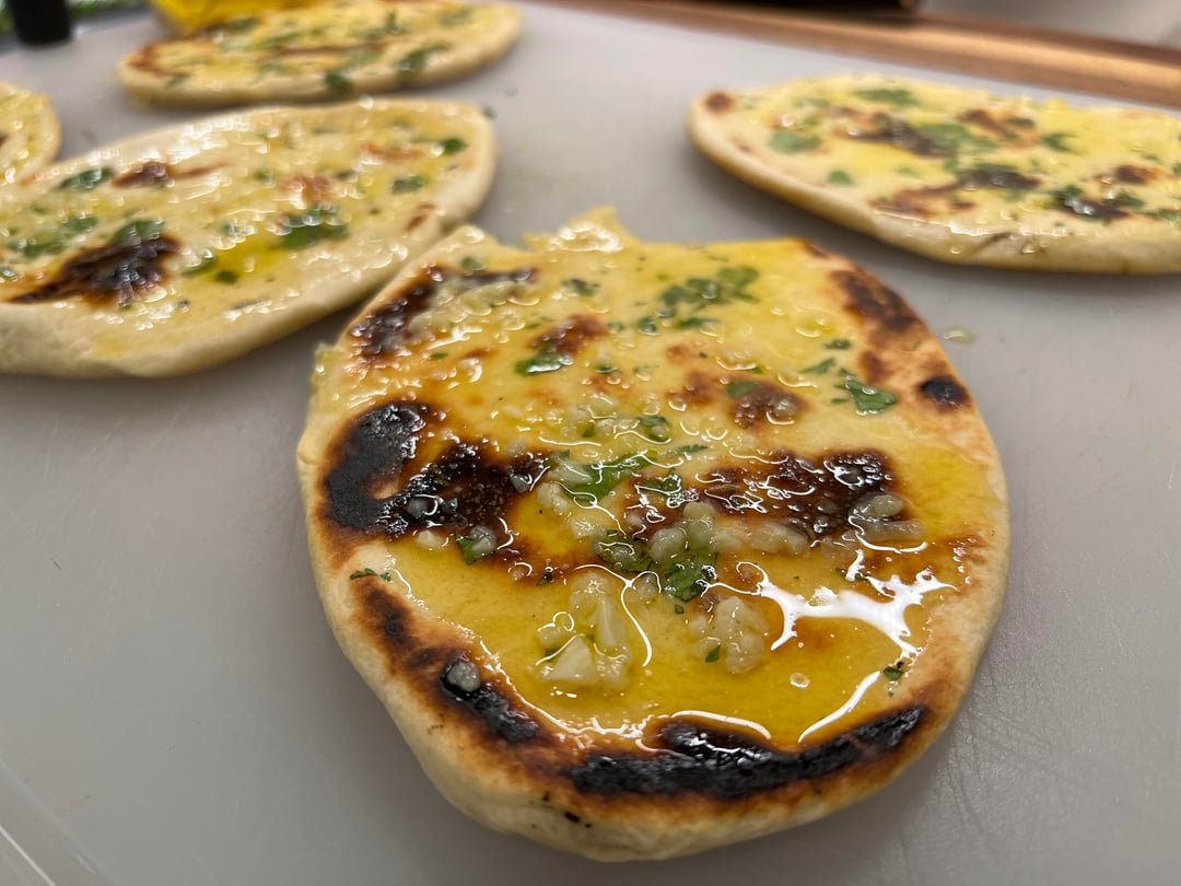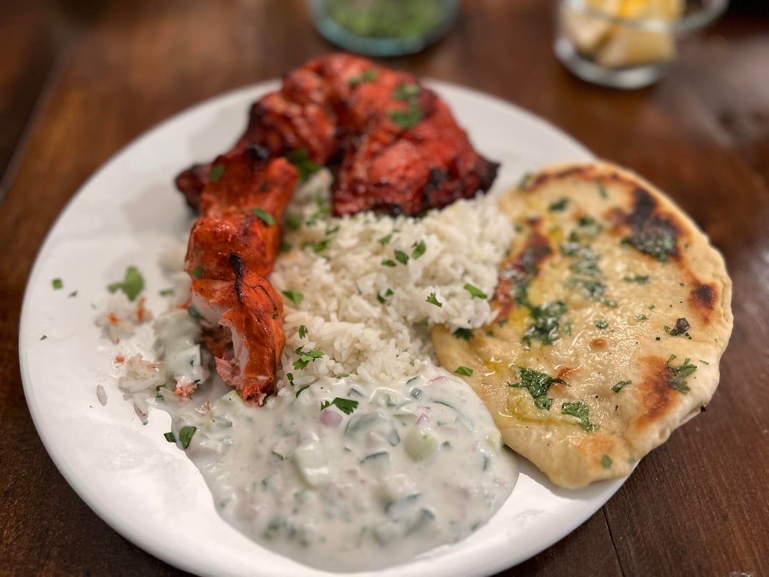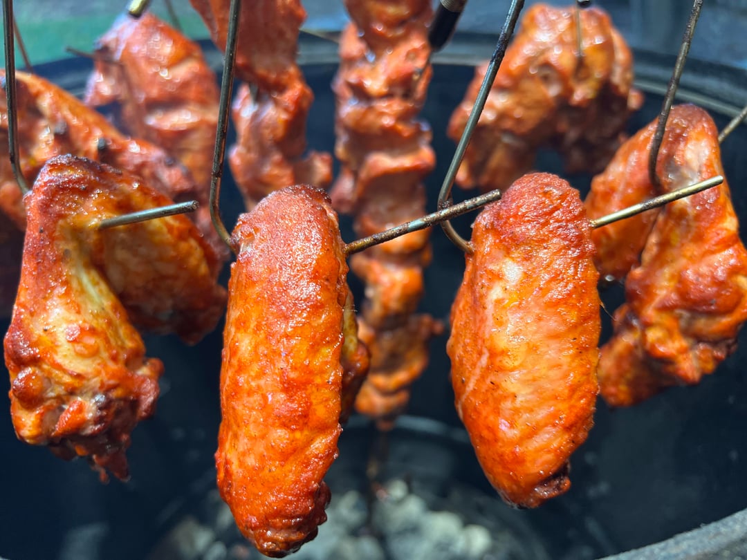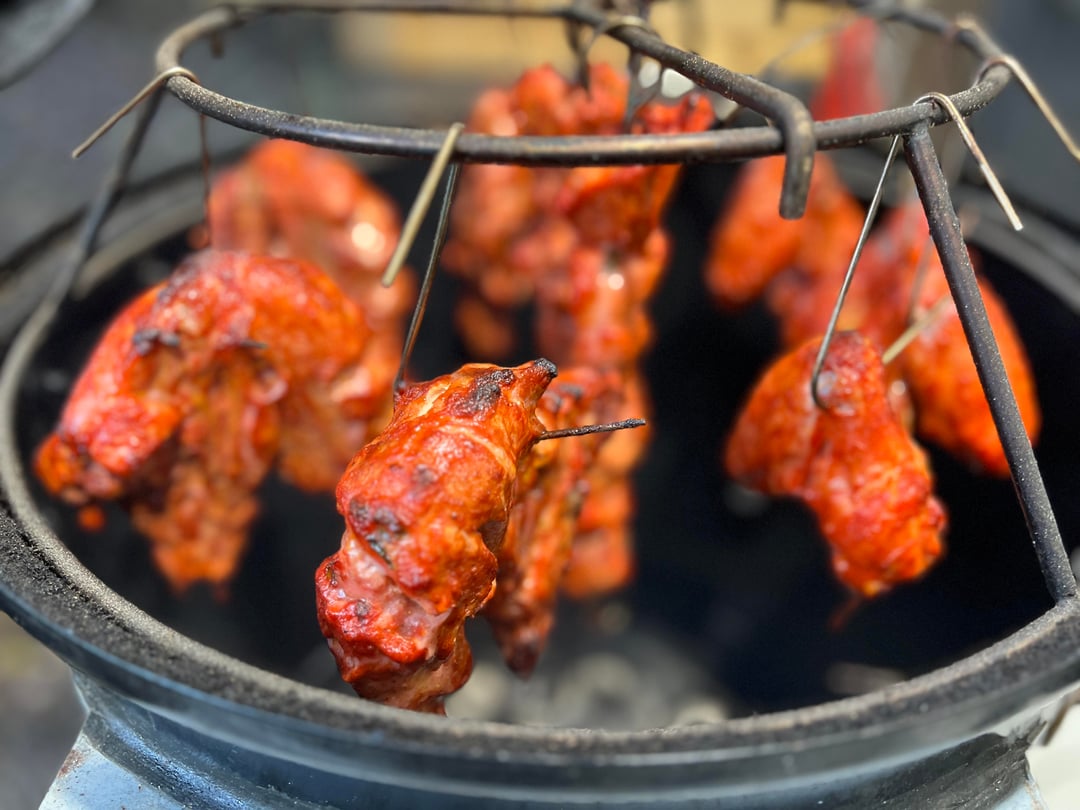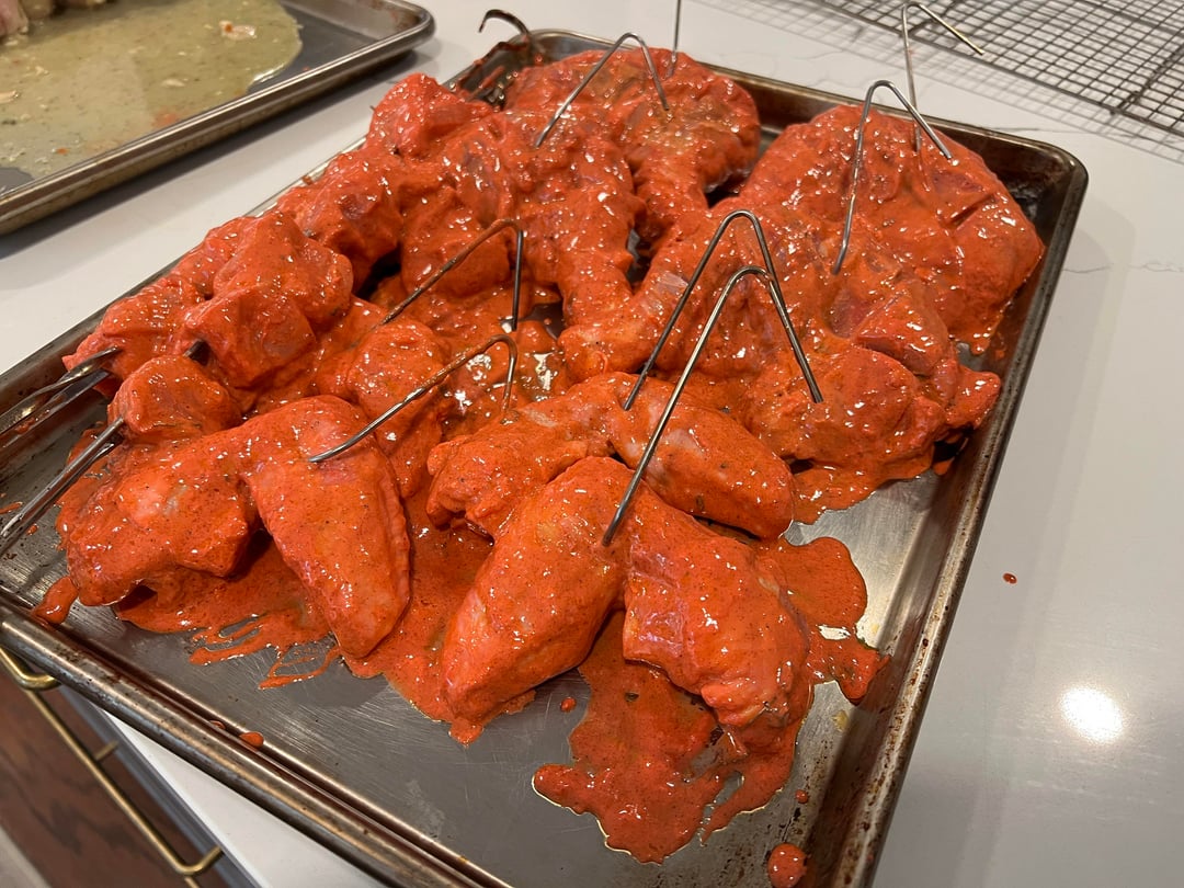 Chud’s did a recent video on Tandoori chicken , garlic naan , basmati rice and a raita sauce. I added it to my list of wanting to try and so followed his recipe. The only differences were that I used breast meat cubed up on a skewer in addition. To the leg quarters and I hung over open coals. I ran the WSM at 350°. Really happy with the results!