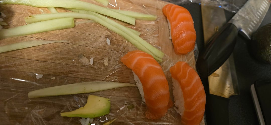 We made salmon nigiri, salmon avocado rolls (add cucumber), spicy crunchy salmon rolls (the post i made earlier that people helped me out on 🙂 thank you!), and i used some of the spicy crunchy salmon to make onigiri for the next couple of days! We had fun and watched Bob's Burgers while we ate together. Perfect sister date. <3