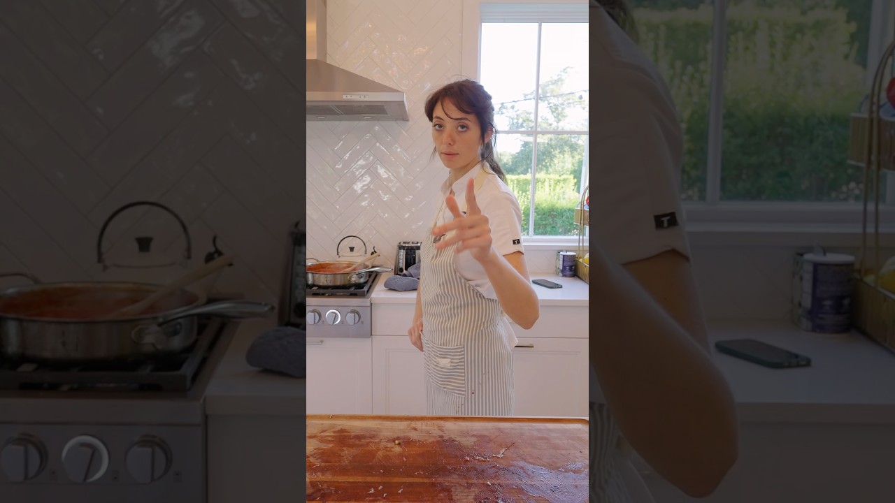 So, these are the chicken thighs. For the chicken parm, we have to take all the skin off. We’re going to roast them in the oven because later I’m going to make them part of the breadcrumb. Next, for the breadrumbs, ripping off this bread. We’re going to put in the oven. Now, we’re going to make tomato sauce, olive oil, tomatoes in the pan, sauce, onion. I just let them cook for a while. So, now in our tomato sauce over here, maybe I’ll throw in some sprigs. Oregano. Maybe we work on the breadcrumbs for the chicken parm. We have parm and pecorino time. A little bit of rosemary, garlic, this bread that I toasted before. Chicken skins. We’re going to start blending them up. Add some of this in there. Chicken skins. Pour this out. Bread crumbs. Salt. All right. Breadcrumbs done. Now we’re going to finish the tomato sauce. I blend it up. Basil. Moscar pone. Sauce. The sauceing. Flour. Then in the egg. And you press it down. I’m going to fry some chicken. Your back. It’s too good.