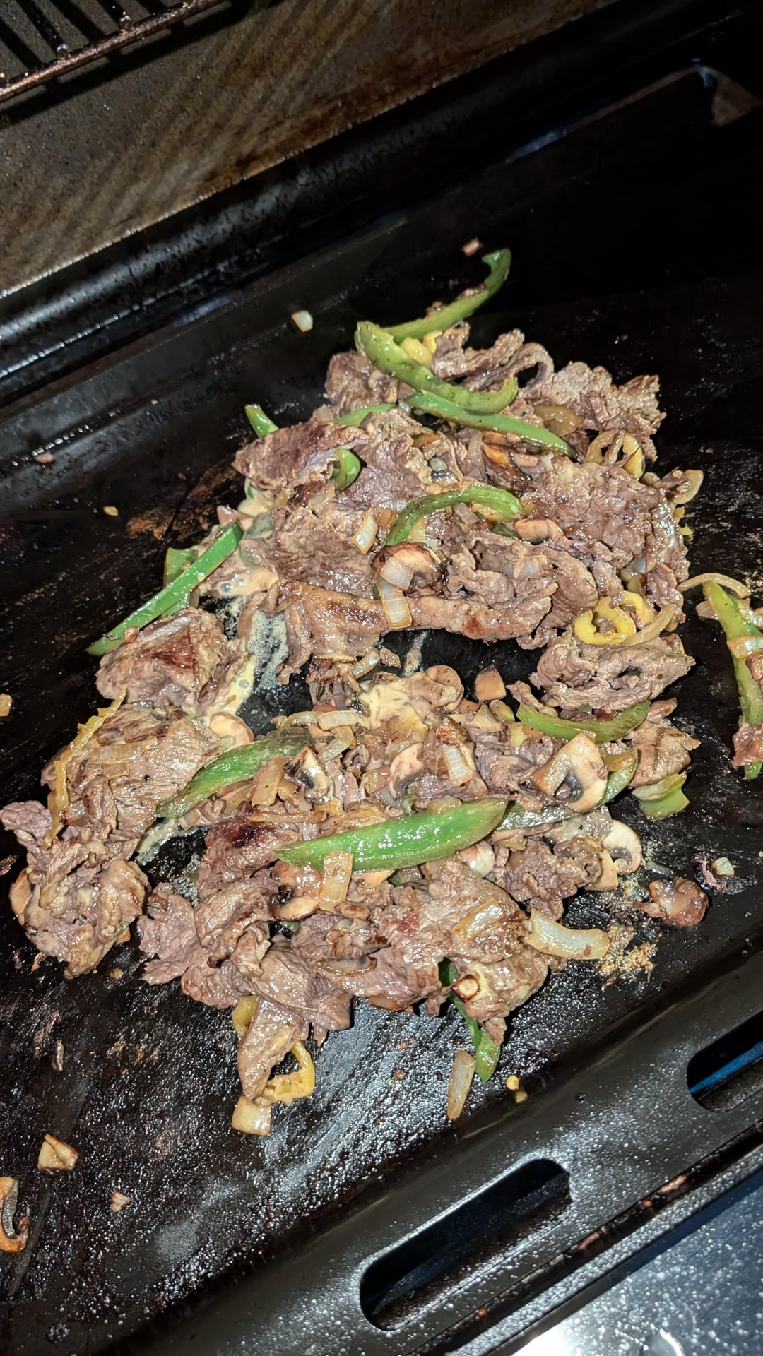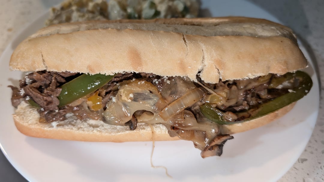 This was a basic attempt with shaved sirloin, white onion, pickled banana peppers, green bell, mushrooms, provolone, and Kraft singles.