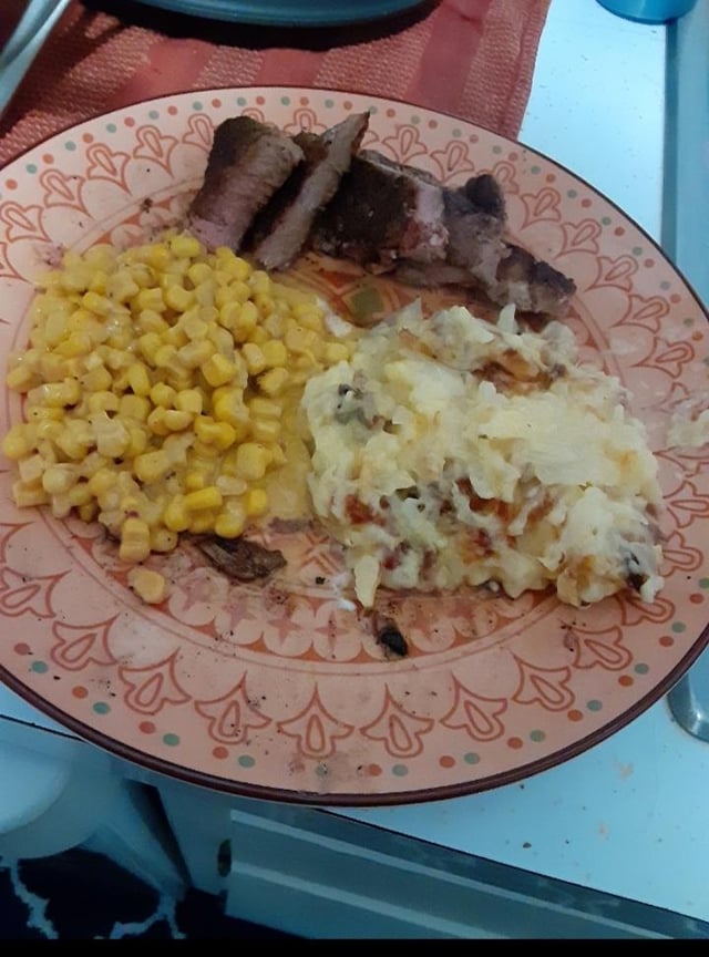 Comfort meal. Pork steak, street corn and shredded cheesy potatoes which are a tad over done.by kabes222 1 Comment jmt8706 9 hours ago Looks really good to me. 🤤