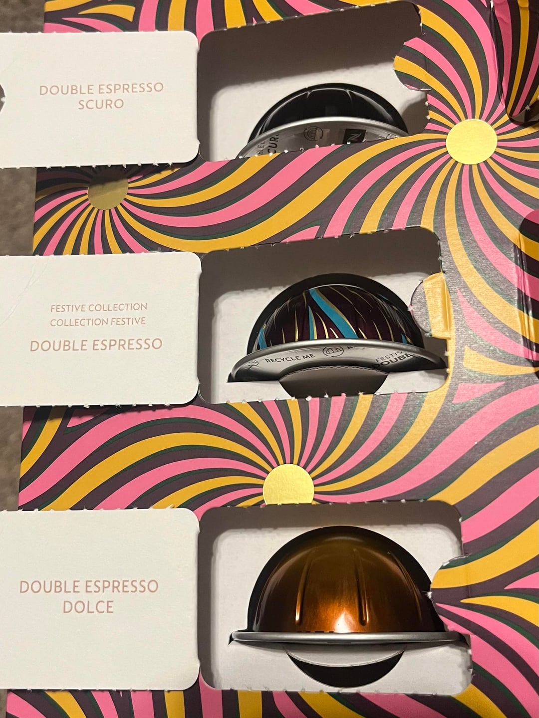 Festive double espresso is mid. This whole thing is wildly disappointing. The Almond and Hibiscus pod is the most interesting one on the list. It’s pretty good. It tricks your brain with the floral notes