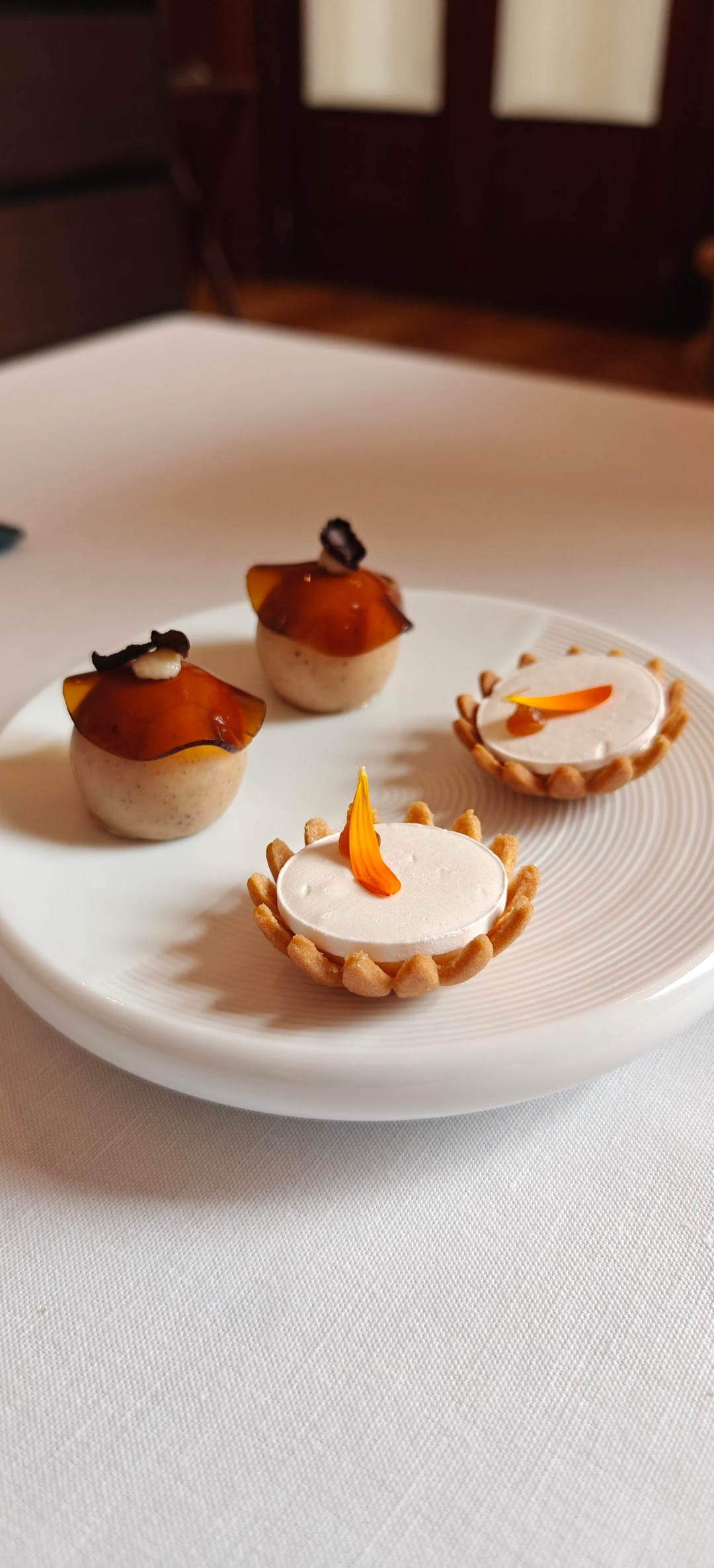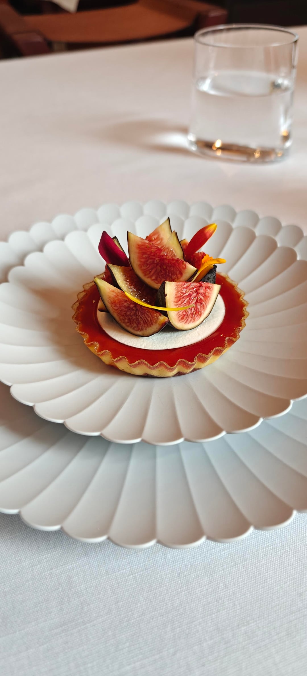 To conclude the meal, the pre-dessert was a Pear Williams with ginger and saké. Although beautifully assembled tableside with another tuile, it was probably my least favorite course. However, it served as a nice pallate cleanser for the actual dessert: a fig tart with vanilla skyr. The petit fours, a tiramisu praline and citrus tart, were accompanied by a mini crème brûlée.